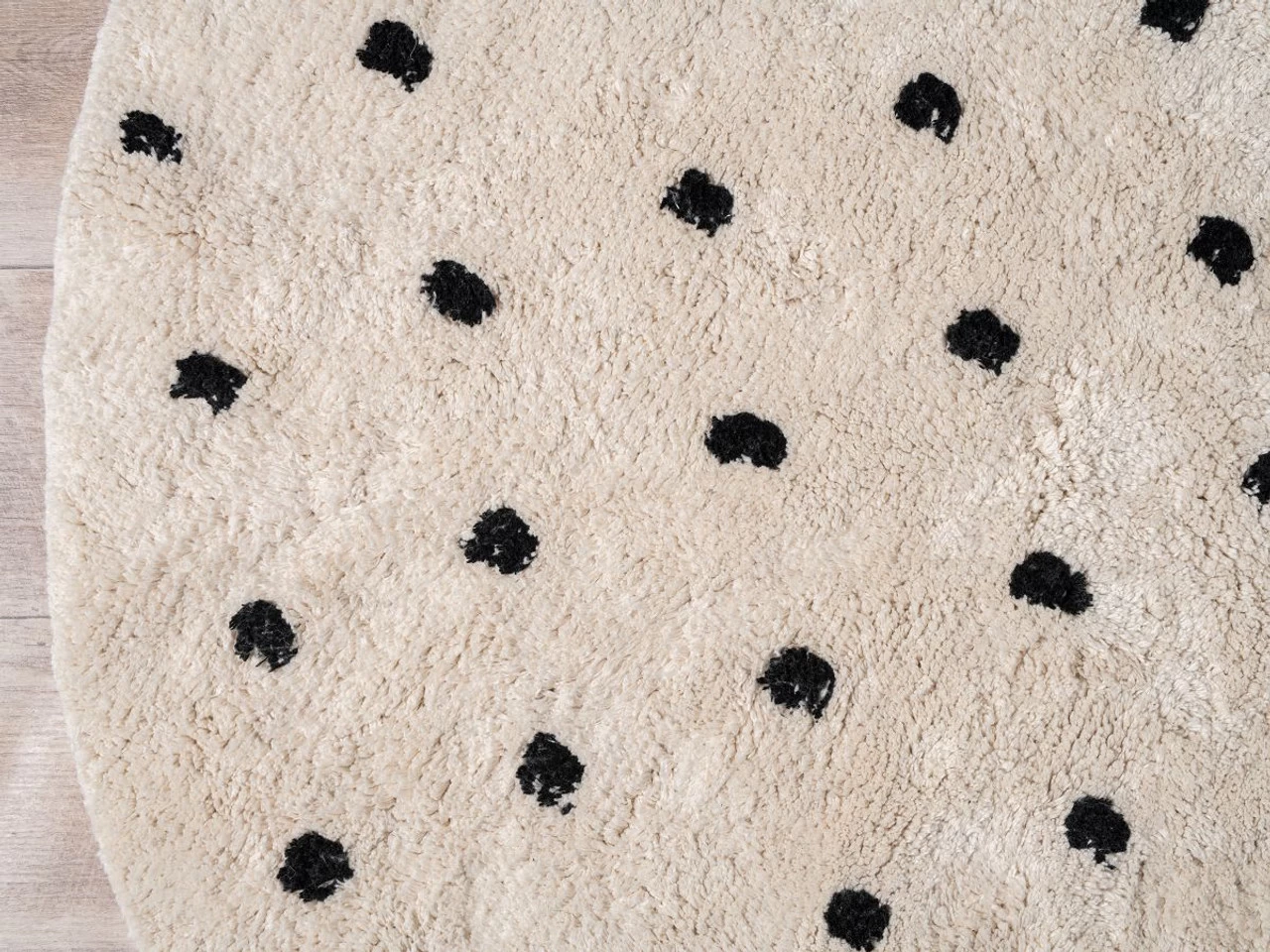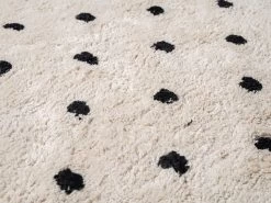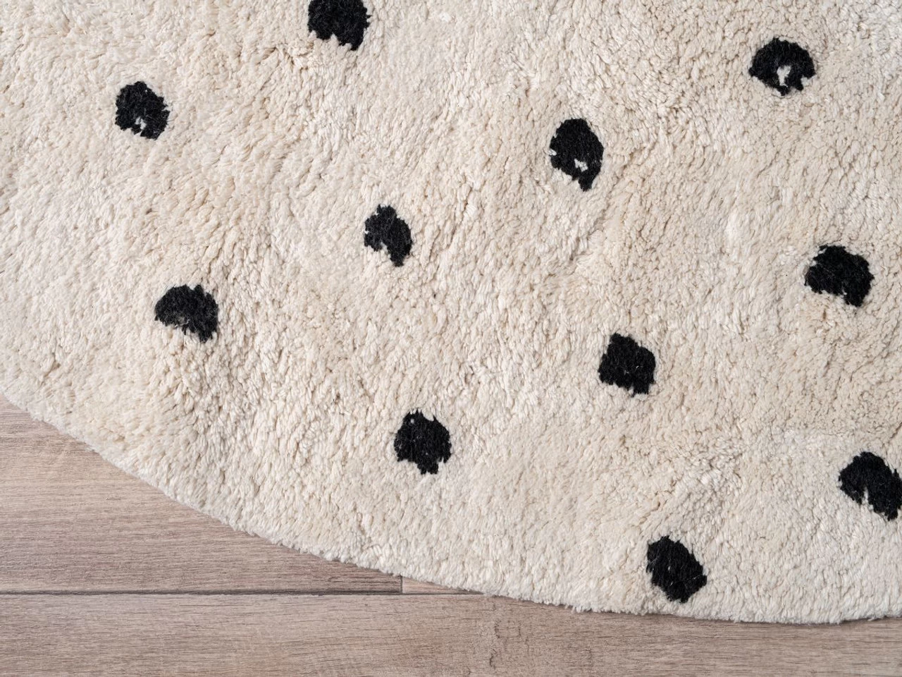 Bring pattern and soft finishes to your home with the Addy Round Spot Rug – Cream/Black. This circular floor rug is made from cotton and has a soft, plush feel underfoot. Perfect as a round kids spot rug for a children’s bedroom, playroom, or nursery, it creates a comfortable space for kids to play and read. The neutral, chic style ensures this rug works in other parts of your home and will add soft texture and subtle patterning to a living room, office, or bedroom. Measuring at 150cm x 150cm, this round cotton rug works as a centrepiece of a space or under a dining table, armchair or rocking chair. We love the creamy, neutral base which immediately makes any space feel cosy, and will pair with a range of interior styles. The black spot pattern gives this rug a unique design to make a stylish statement in your home.