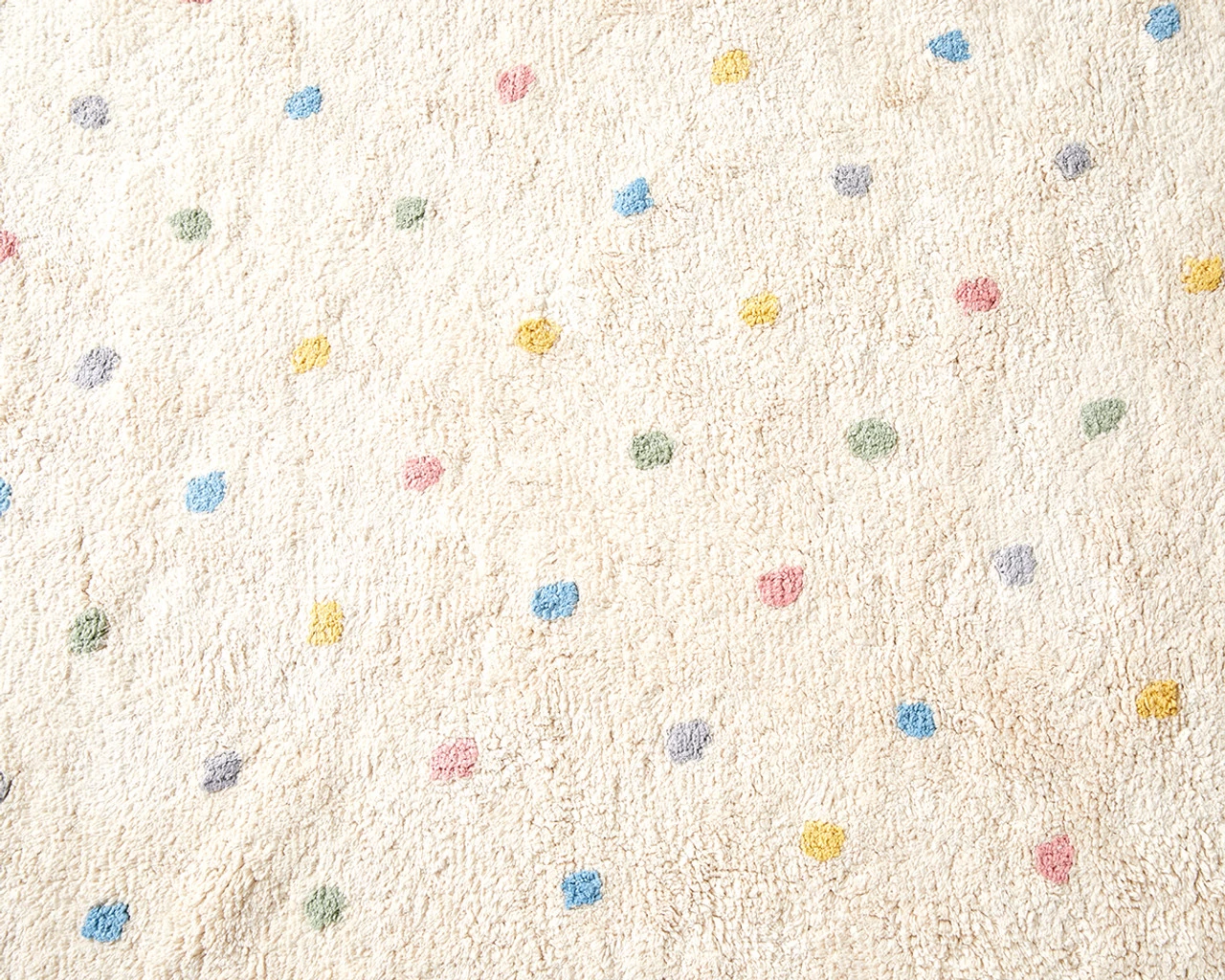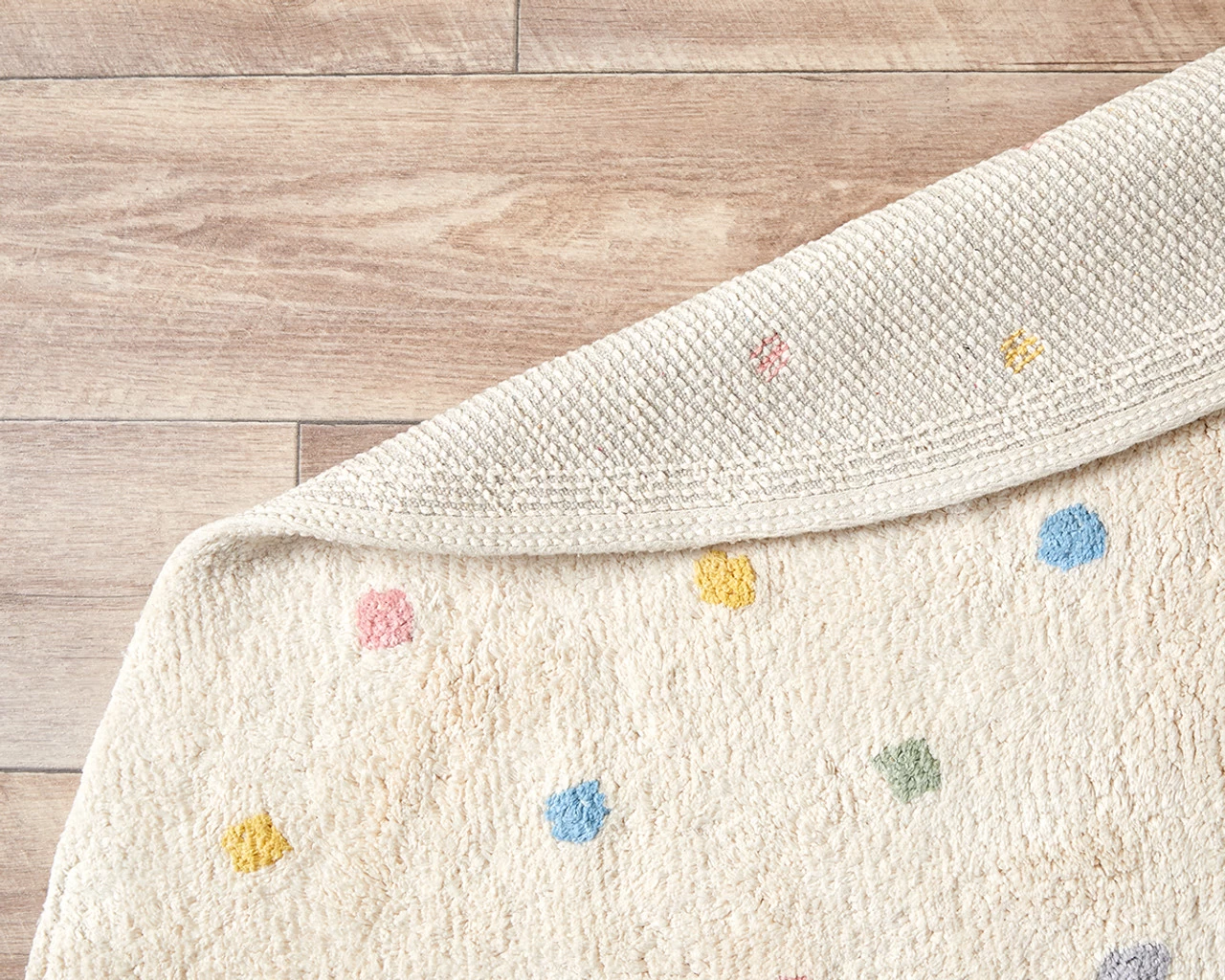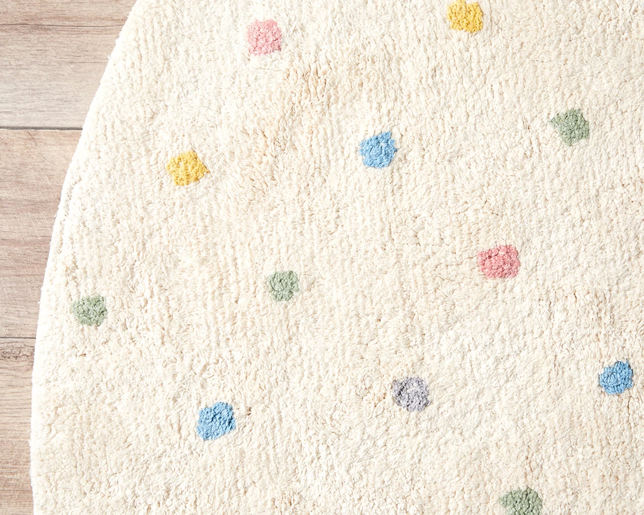 Add a whimsical, playful style to your kid’s bedroom or play space with the Addy Round Spot Rug – Multi. Handloomed with a plush feel underfoot, it’s made with cotton for a soft and durable texture. The creamy base and multicoloured spot pattern make any space feel cosy and bright.