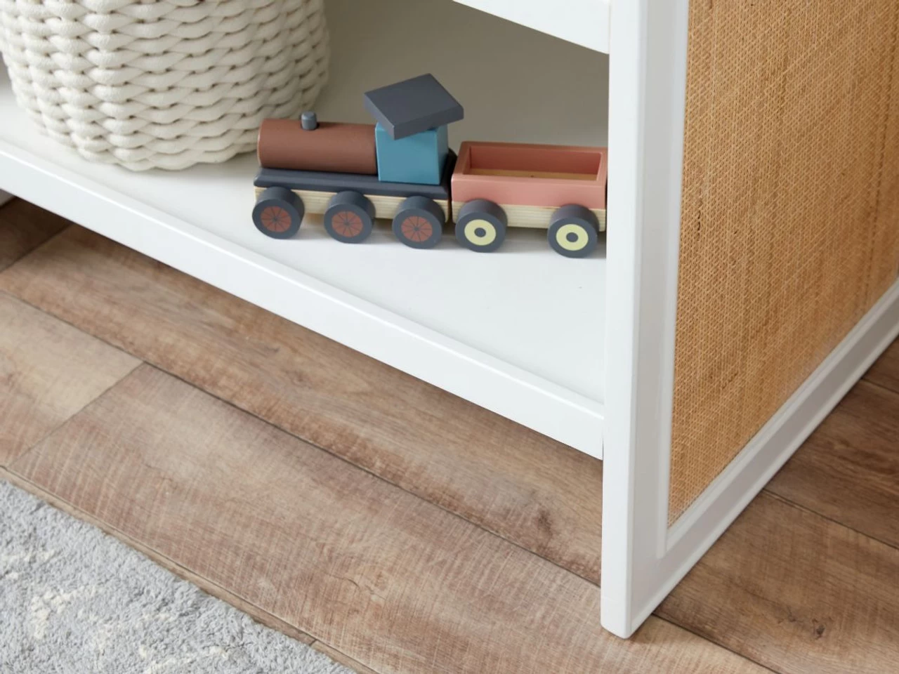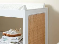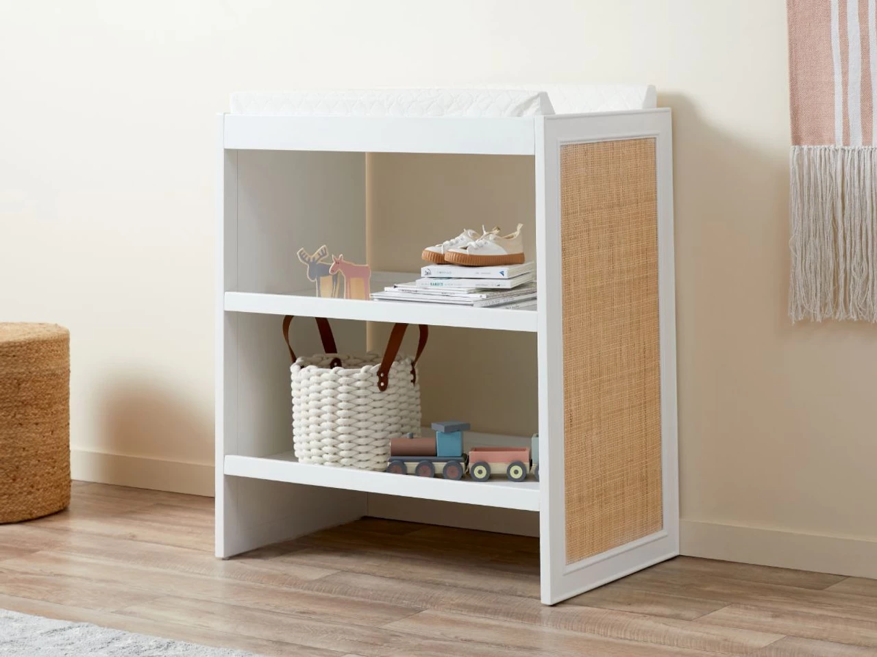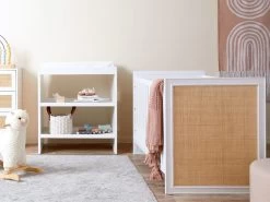 Add stylish rattan furniture into your nursery with the Alexandria Rattan Change Table – White/Natural. This natural rattan and solid poplar wood change table features a wide tray on top, and when paired with our Change Mat creates a comfortable space for your baby to lay on as you change their nappy. Two storage shelves are located underneath the changing tray, so you always have the essentials like nappies, wipes and clothes on hand. We love the crisp white colour which allows the rattan panelling to stand out.
