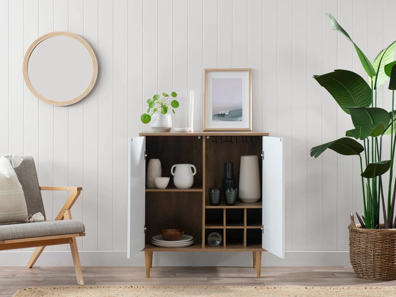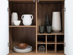 Brighten and tidy your home with the Alps Two Door Cabinet. This versatile storage unit is a useful addition in any household to store a range of small and larger items. Featuring two swing door cupboards, each compartment includes internal shelving in various sizes, so you have the ability to store a range of household items. Perfect as a drinks cabinet this unit features wine bottle compartments and rails for hanging up wine glasses or stemmed flutes. While not only adding to the storage in a room, this unit also provides the ideal surface to display décor, family photos and plants.