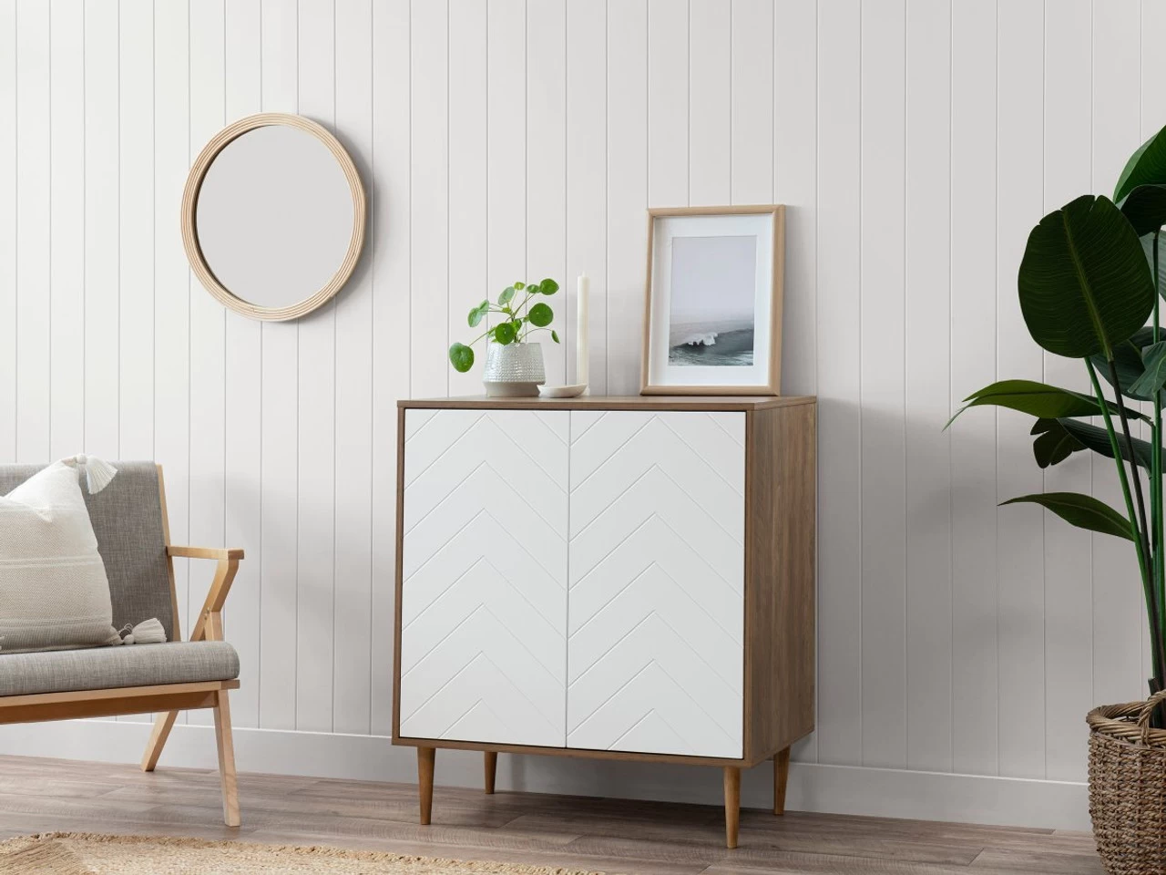 Pairing a handsome dark wood with bright white doors, this home storage unit is super easy to style into any room. The standout feature of this cabinet is the subtle chevron patterned doors, providing a point of interest to a room. Love this signature look? Then be sure to check out the rest of the Alps range. Bring a new height of style into your home with the stunning Alps Two Door Cabinet.