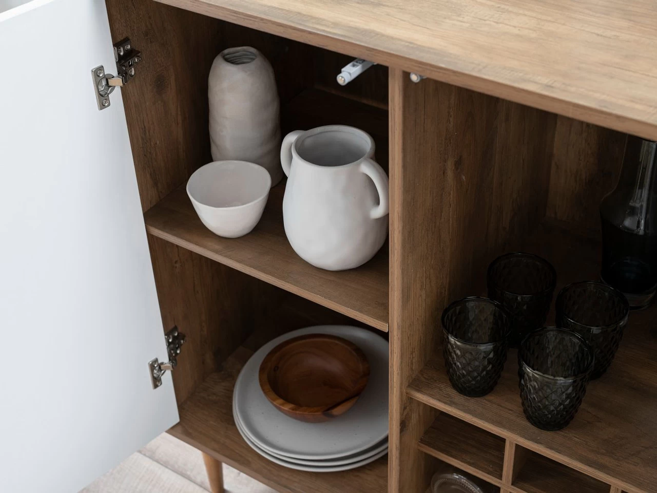 Each cupboard benefits from soft close push mechanisms and strong hinges so opening and closing them is always smooth. This handle-less design also helps keep the streamline look of the cabinet. Whether to be used in the dining room, office or open living space, this cabinet will keep rooms tidy and clutter-free.