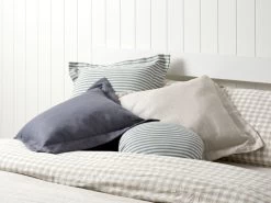The Ari Linen Blend Thin Stripe Square Cushion โ Seafoam Blue is an easy way to change up the style of your home with pattern and new, seasonal colours. With a lovely, linen blend fabric and a plush, filling, this striped throw cushion is soft to the touch and adds sink in style to your couch or bed. With a 5cm stitched, border around the edge, this cushion keeps its shape for everyday use. We love the natural weave of the linen blend fabric and the double-sided, thin stripe pattern in a chic seafoam blue colourway that will add calm, coastal style to your home.