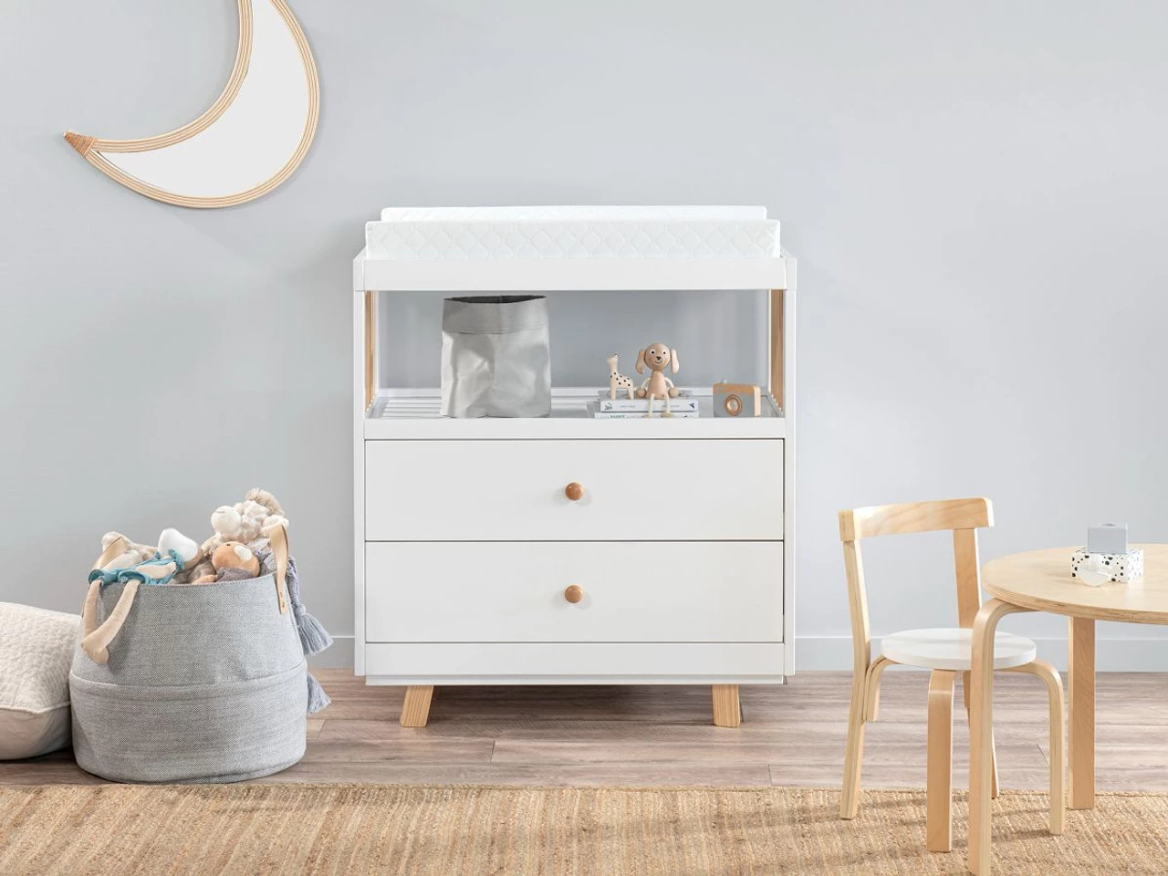 Storage is essential when you have a baby, which is why any parent will love the Aspen Change Table with Drawers – White/Natural. With a large open shelf and two spacious drawers, this modern change table makes the most of limited space by incorporating storage options. No need to reach far for fresh nappies or wipes, simply pop the essentials in the shelf and drawers and have everything within easy reach.