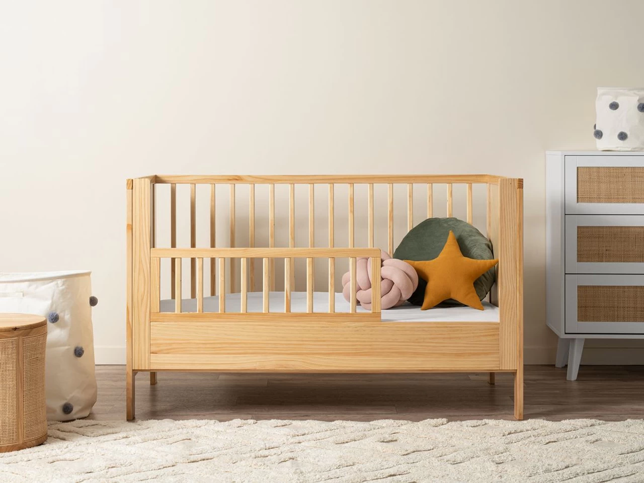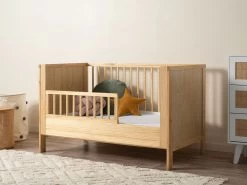 The Mocka Aspiring Cot Toddler Bed Half Frame – Natural turns your current cot into a safe, toddler bed with guard rail – the perfect protection to keep your little one safe and sound as they sleep. Installation is easy, simply remove the side panel of your Aspiring Cot and attach this toddler half frame side in its place. Kids will be able to climb in and out of bed themselves, and parents won’t need to worry about their little one falling out of bed in the night. With the same timber finish as the Aspiring range, the adaption is flawless and continues the gorgeous warm, natural style.