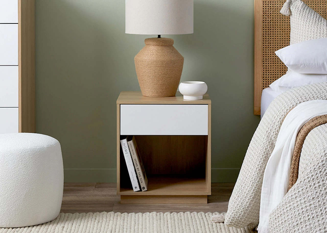 Bright and airy, the Avoca Bedside Table is a modern coastal side table just right for beside your bed. With its clean lines and white/natural finish, this bedside table will bring fresh, beachy style to your primary bedroom, guest bedroom or around the home. It features a convenient sliding drawer that easily glides open to reveal ample storage space for all your bedside essentials. The open shelf below is the perfect spot for storing books, magazines, or decorative accents. An affordable way to create a modern coastal bedroom, you’ll love its light and airy design.