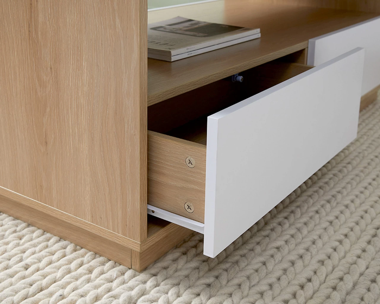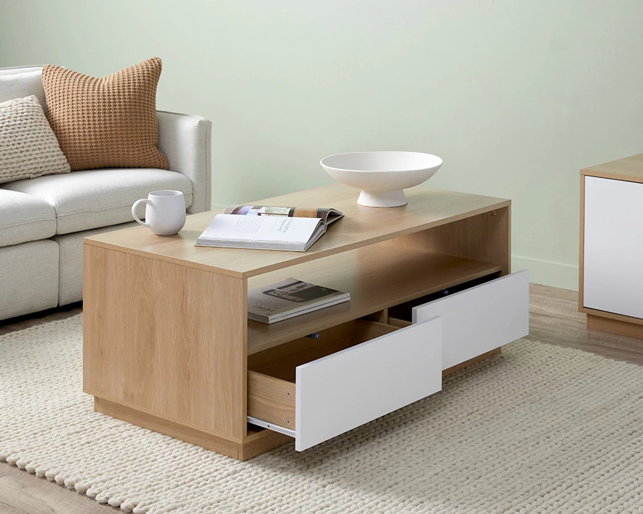 Pairing modern design with coastal sensibilities, the Avoca Coffee Table is a statement coffee table for your lounge or media room. The warm natural tones of the frame pair beautifully with the soft white of the drawer fronts for a style that is fresh, light, and airy. Featuring two sliding drawers and a spacious open shelf, it keeps your essentials organised and within reach. Rest your drinks, snacks, or books on its surface, while conveniently storing remote controls and magazines in the shelf below. Sleek and compact, decorate the surface with a tray, coffee table books or an assortment of decor pieces. At an affordable price-point, it offers amazing value and can be matched back with the rest of the Avoca range for a modern coastal look throughout your entire home.