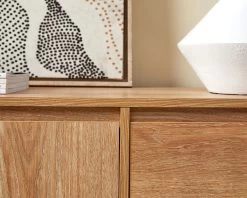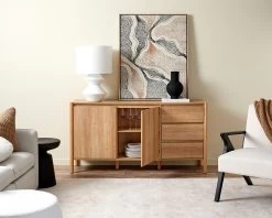 Inspired by timeless Japandi design, the Blair Buffet is a versatile sideboard and buffet unit for your home. Combining form and function seamlessly, it has tubular legs and clean lines for a look that will suit any home. Its natural wood tone finish gives it an inviting warmth and pairs easily with a range of styles like Modern, Coastal, Boho and everything in between. Thoughtfully crafted, it features three sliding drawers and two cupboards, offering ample storage space for home essentials. An ideal choice for your dining room or open plan living space, use it as a buffet unit for storing dinnerware, table linens and more. Style the surface with greenery, vases and decor and place the buffet under a mirror or piece of artwork for an inviting and stylish space.