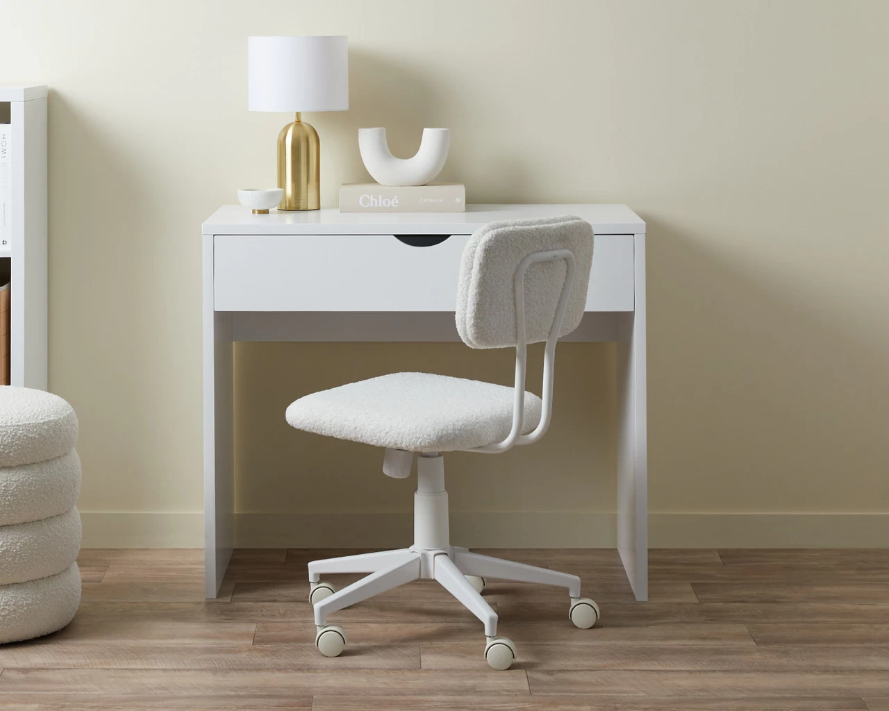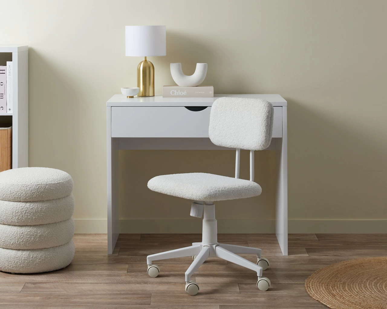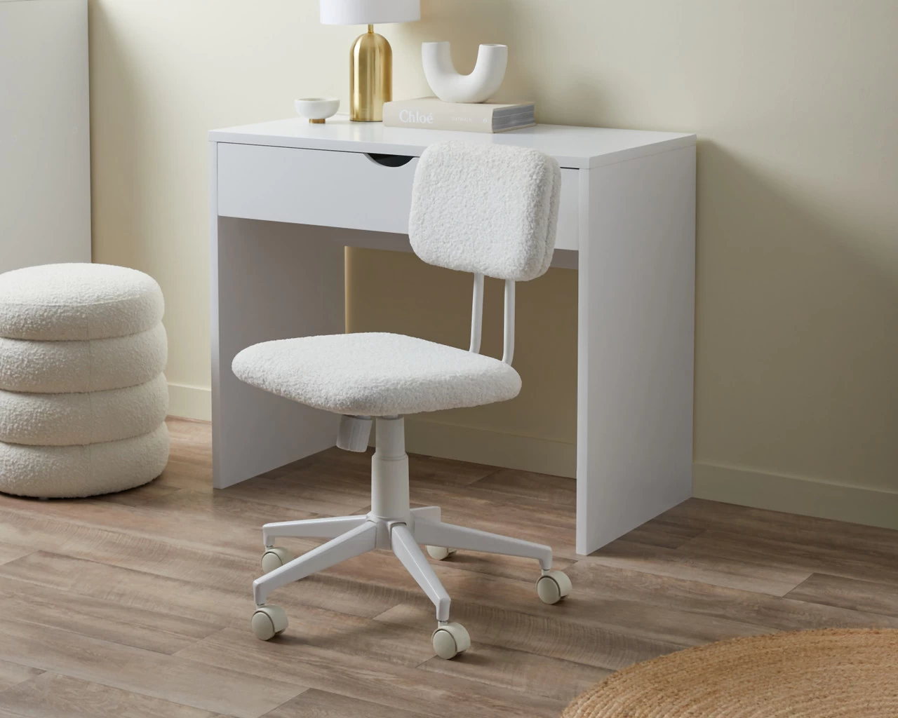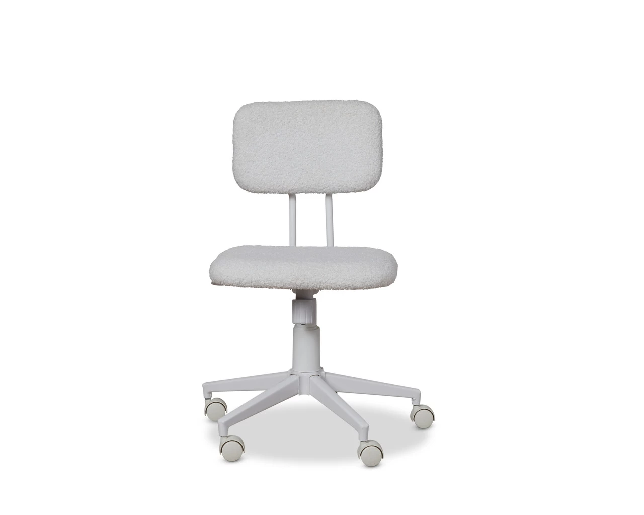 Add dreamy, cosy style to your workspace with the Bobby Office Chair – White. Made with a white teddy fabric, this desk chair is soft to sit in and gorgeously stylish. Perfect for creating a tranquil home office you’ll adore to be in whether that’s working from home, studying, or enjoying your hobbies. Ideal for adults and children, it has a padded seat and backrest for all-day comfort. Easily adjust the height to suit your needs using the durable gas lift and enjoy the hard tyred castor wheels that are perfect for use on carpet.