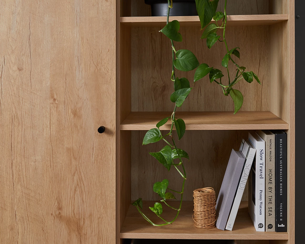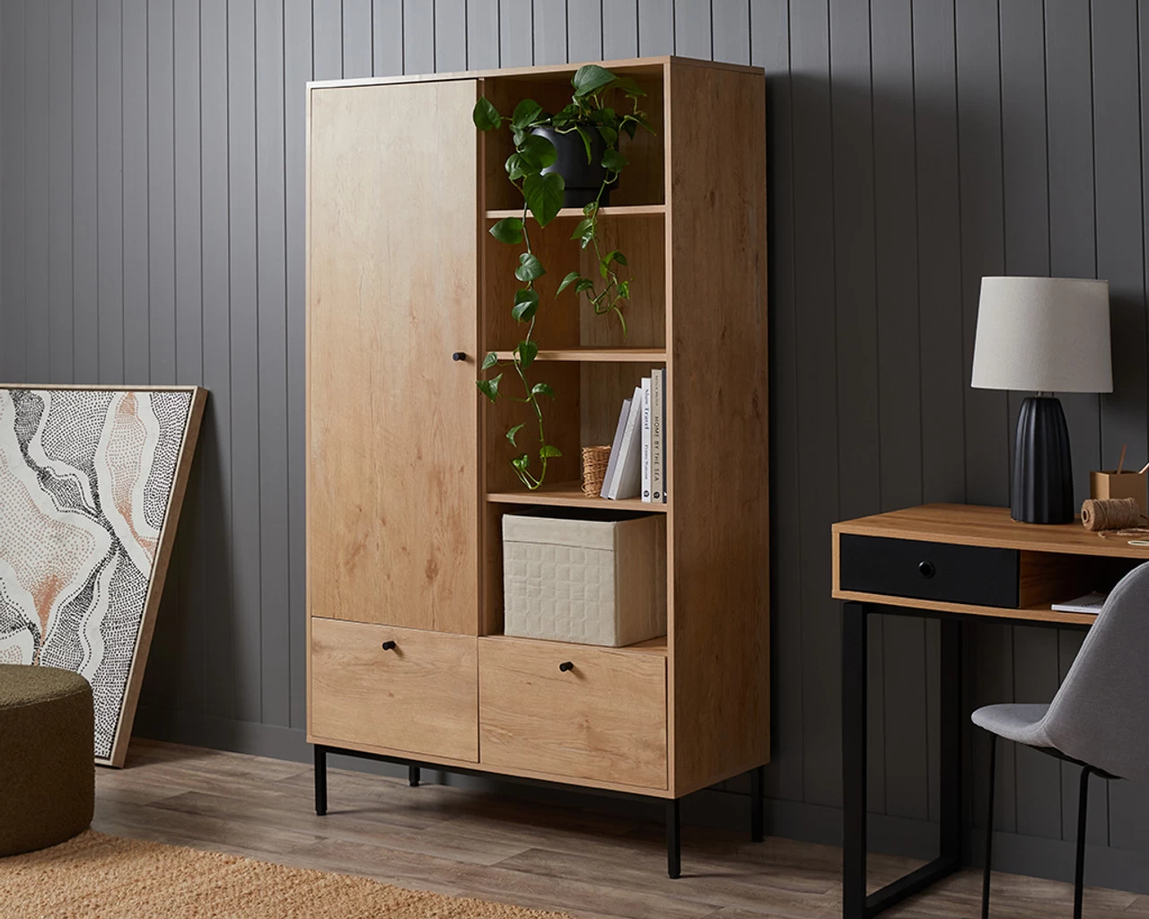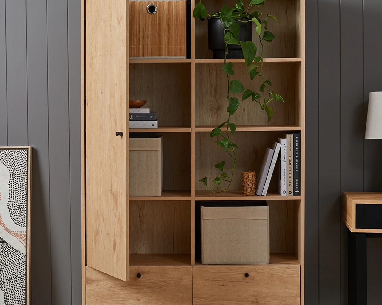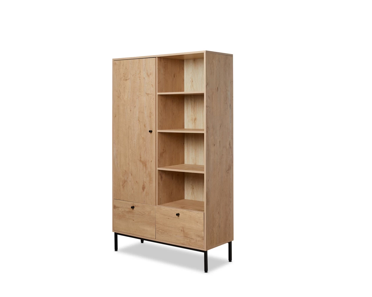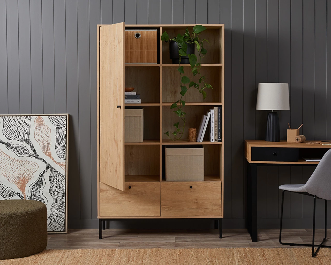 The Brixton Bookcase increases the storage and display space in your home. With a natural wood look finish, this large storage piece will easily suit a range of decors and adds casual, warm style to your home. Exclusive to Mocka, it has versatile storage with open shelves for styling books and décor, a cupboard with adjustable internal shelves and two bottom sliding drawers. It’s well-constructed, with a natural wood look finish and black metal legs and handles. Perfect for the living room, dining room or home office, create your ideal clutter free, stylish home.
