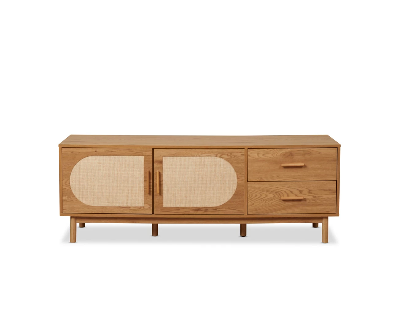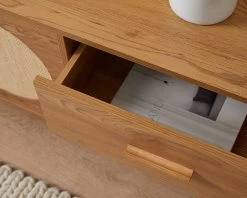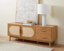 The Canyon Entertainment Unit is a stylish and practical addition to your living room. Featuring a wood grain finish and arched rattan panels on the cupboard doors, it’s an on-trend statement piece that can’t be ignored. A great way to add a warm, organic style to your living spaces, it looks great under a wall-mounted TV and is the perfect place to display decor. The TV unit has two cupboards and two sliding drawers, so you can store all your entertainment essentials and keep your lounge area tidy and organised.
