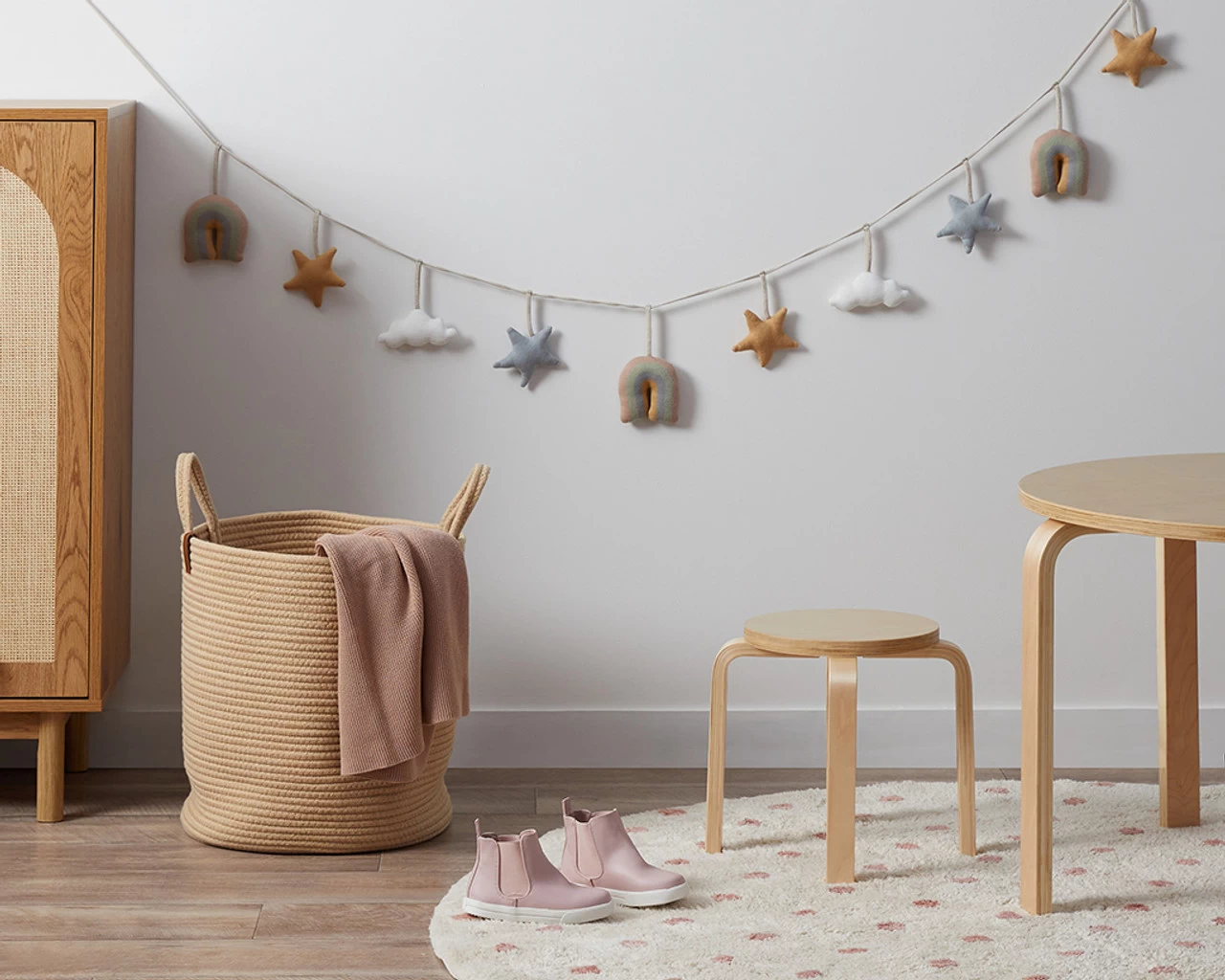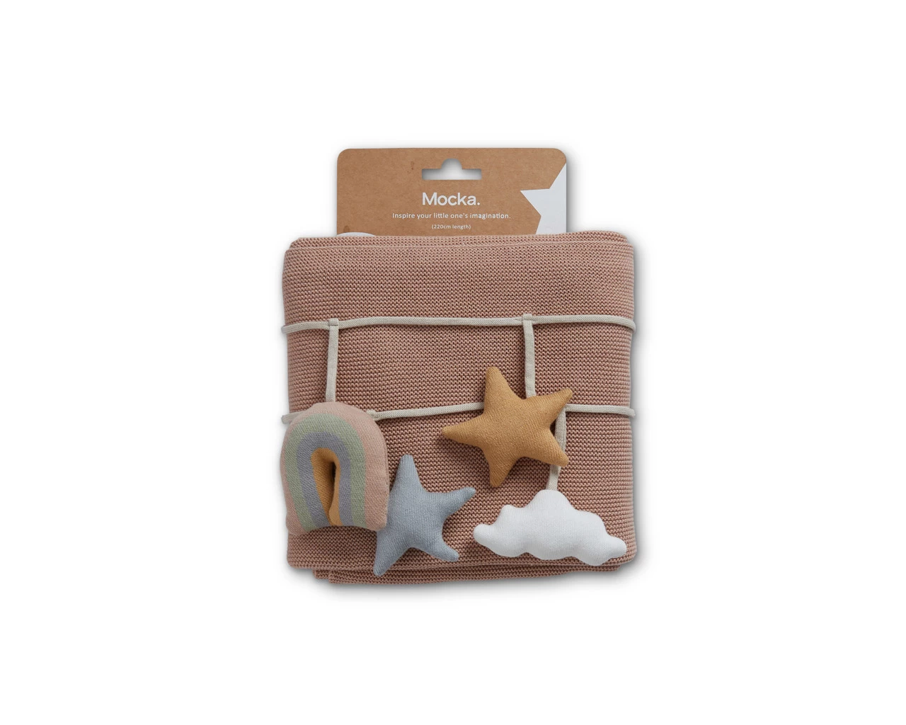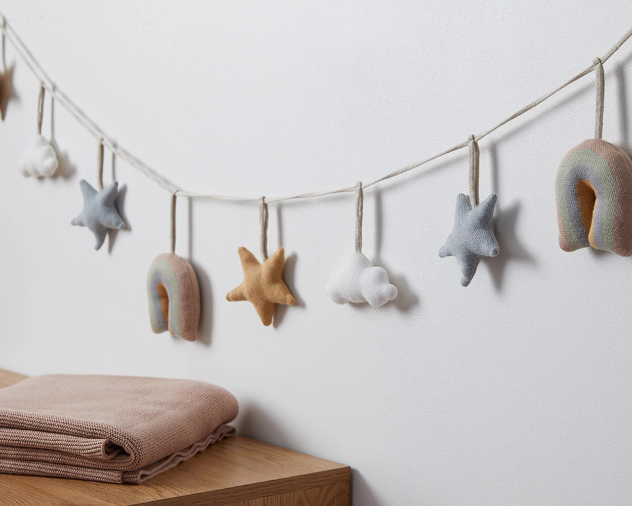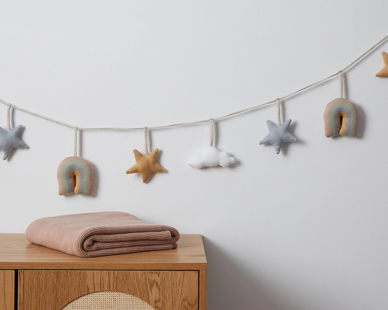 The Dream Bunting and Blanket Set is an adorable decor piece for any parent looking to add some whimsy to their little one’s space. With a playful design featuring hanging stuffed toys in the shape of rainbows, clouds, and stars, this bunting is sure to delight your little one and make their space feel extra special. Both the bunting and blanket are made from 100% cotton, which feels soft and cosy. The blush pink colourway of the blanket adds a dreamy touch that perfectly complements the rainbows, clouds, and stars of the bunting. Easily hang the bunting on any wall or corner of the room. So, whether you’re looking to create a calming space for your newborn or add some fun and whimsy to your toddler’s room, this bunting and blanket set is the perfect choice.