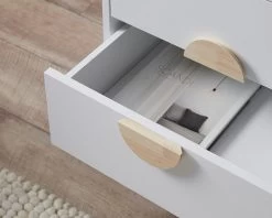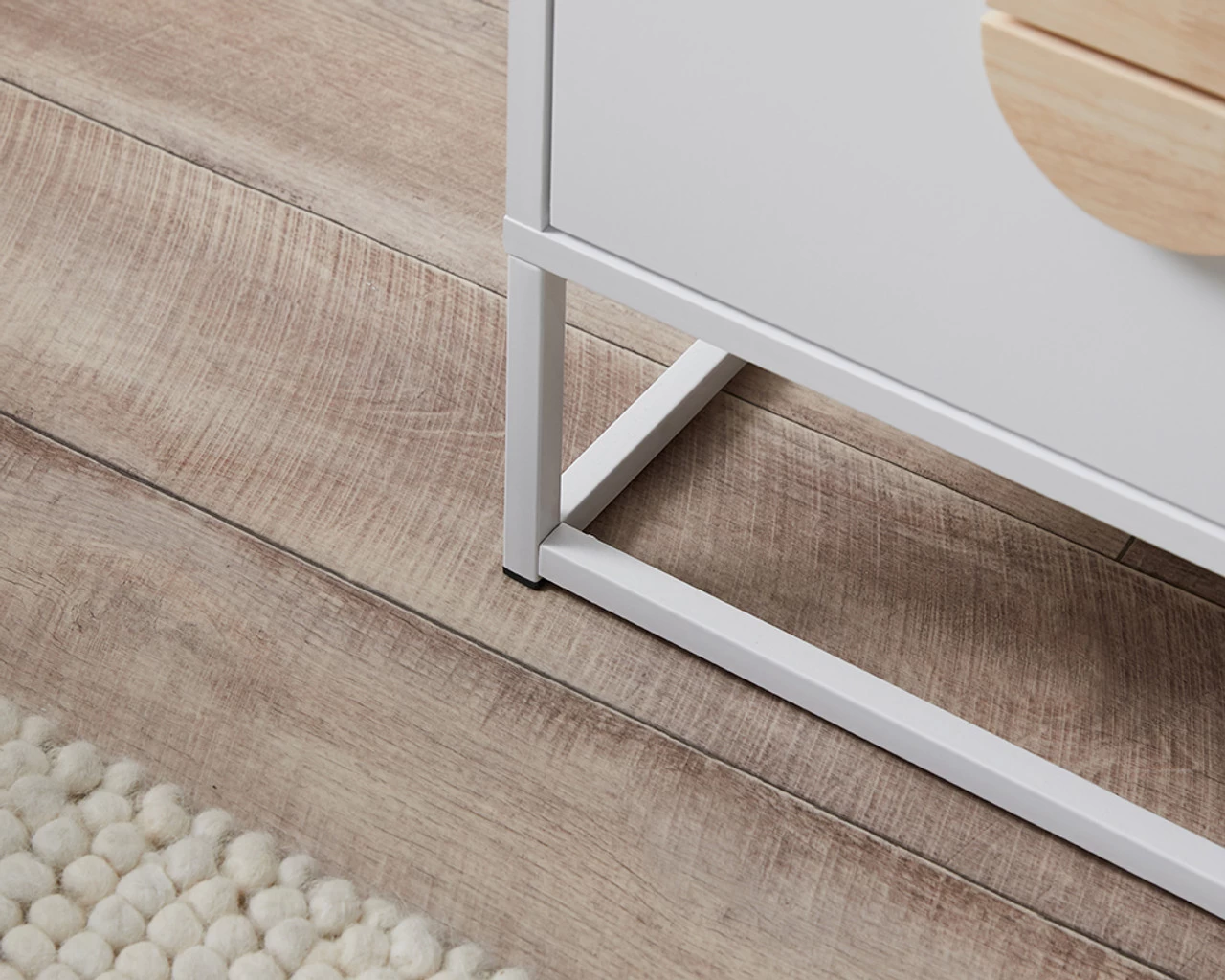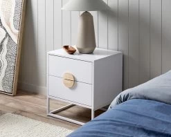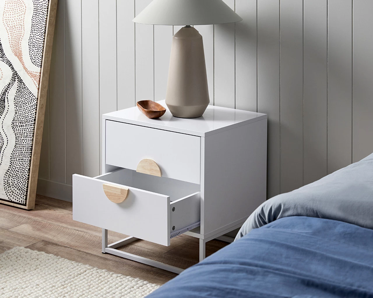 Create an on-trend contemporary bedroom with the Eclipse Bedside Table – White. Wonderfully modern with its sleek, straight lines, the statement feature of this side table is the round rubberwood handles for on-trend curves. The fresh white colourway brightens any space and is an effortlessly stylish addition to the main bedroom, guest bedroom, kid’s bedroom, or nursery. Made for styling, the surface has plenty of room for the warm glow of a lamp and décor. The two spacious drawers are the perfect spot for bedroom essentials and slide open smoothly and quietly. Browse the rest of the Eclipse range for more modern contemporary furniture.