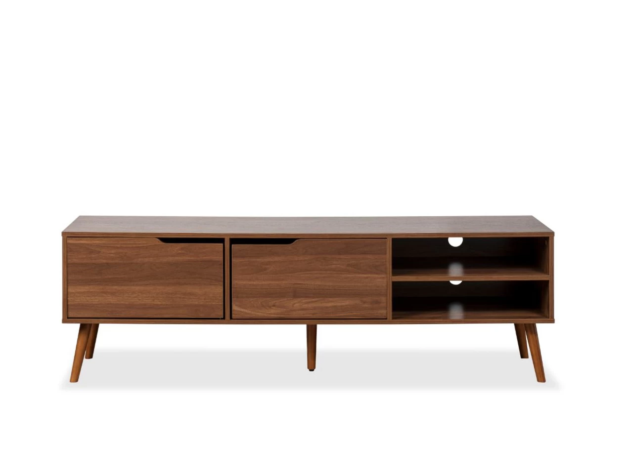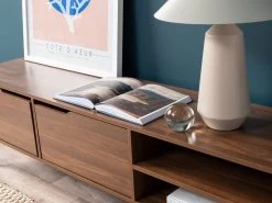 With a classic, mid-century inspired vibe, the Edmond Entertainment Unit will transform your living room. This TV unit will take centre stage when placed under a wall-mounted TV, piece of art or your favourite decor items. With two open shelves and two cupboards, you’ll have space for all your home entertainment devices and needs. The back panel even features a hole to keep cords tidy and out of sight. We love the dark walnut colouring which adds a richness to any interior.