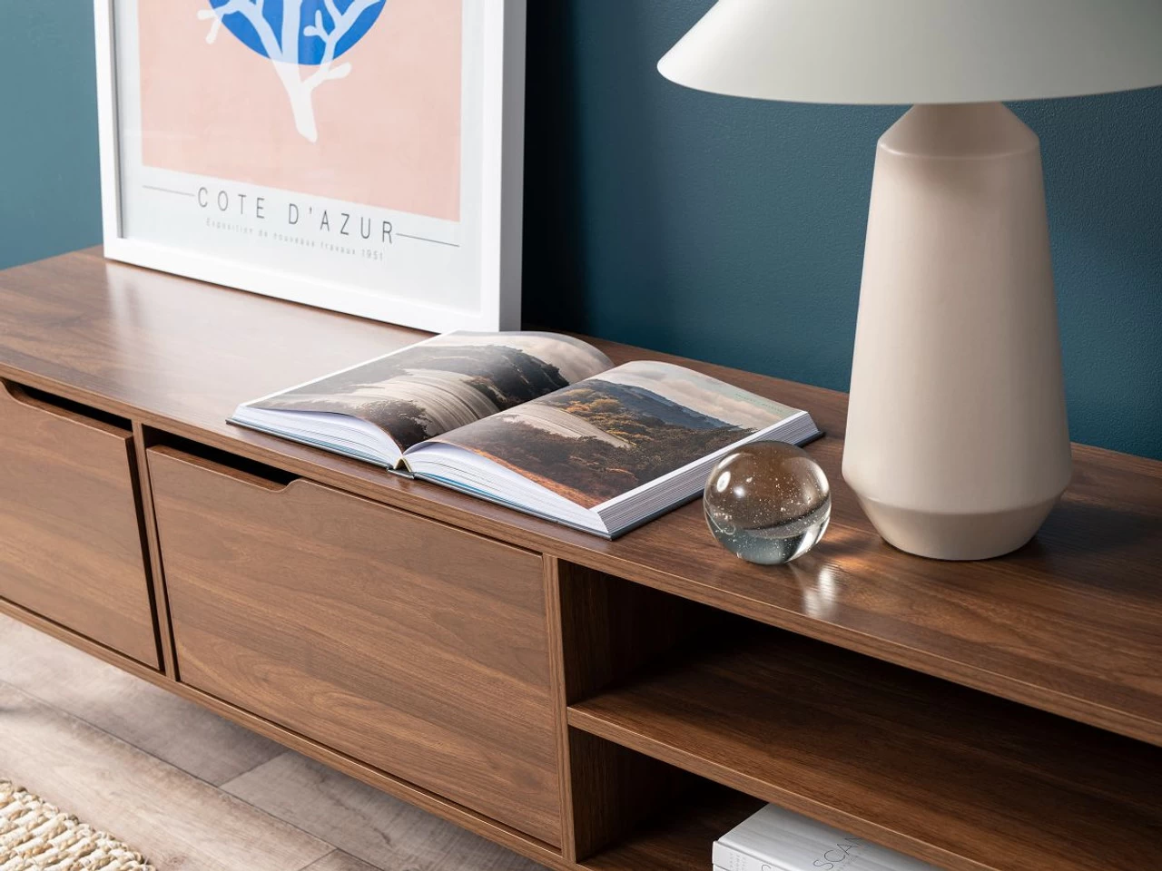 We love the mid-century inspired design which gives this TV unit it’s classic, timeless feel. Washed in a dark, wood-look, the finish showcases the shades and patterns of natural wood and adds a distinct richness to any interior. Ideal paired with natural tones like rattan and woods, or with varying shades of greens and deep blues. If you love this look, be sure to check out the rest of the Edmond range. Create a lounge room space to relax in with the Edmond Entertainment Unit.