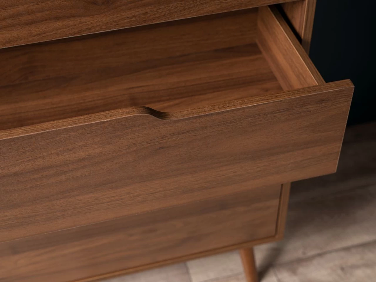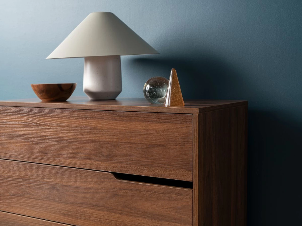 The Edmond Four Drawer is a mid-century inspired chest of drawers. Perfect for a master bedroom, kids’ bedroom or a guest suite, this four-drawer dresser creates a timeless, wooden statement in any room. Perfect for storing clothes, accessories and more, this medium sized unit has four spacious sliding drawers with a handless design. We love the dark walnut colouring which adds a richness to any interior.
