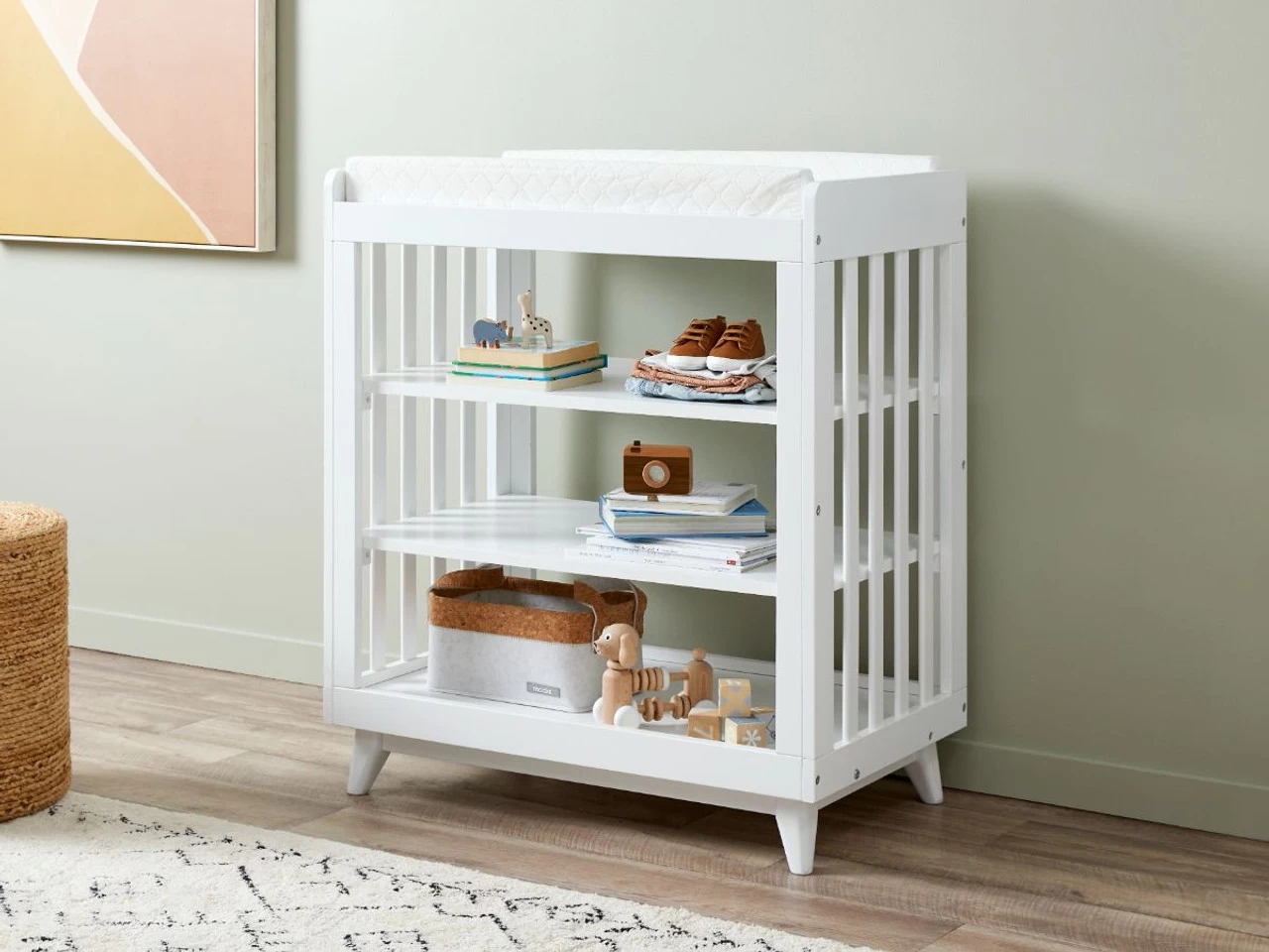 The top tray is wide and spacious, so your baby feels comfortable and protected. Try our change mat – it perfectly suits the dimensions of the unit. Complete with three spacious shelves, you’ll have plenty of storage for essentials, clothes and toys. And located just under the changing – they’ll all be within easy reach. Use baskets, fabric boxes and other shelving storage to help keep everything organised on the open shelves.
