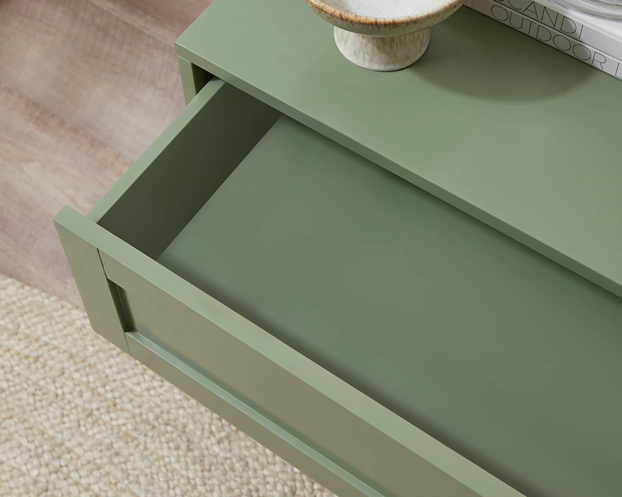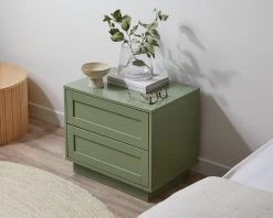 The Eros Bedside Table – Sage Green is inspired by classic design and on-trend colours. It’s shaker style drawers and sleek profile is super stylish and creates a statement beside any bed. The soft, sage green colourway taps in to the trend of bringing the outdoors in, ensuring your bedroom feels calm and stylish. Two drawers offer ample storage for night-time essentials. The push-to-open, handle less design of the drawers gives it a modern touch and ensures opening and closing drawers is smooth and quiet. Perfect for a main bedroom, kids’ bedroom or guest bedroom, style the top with a lamp and décor.