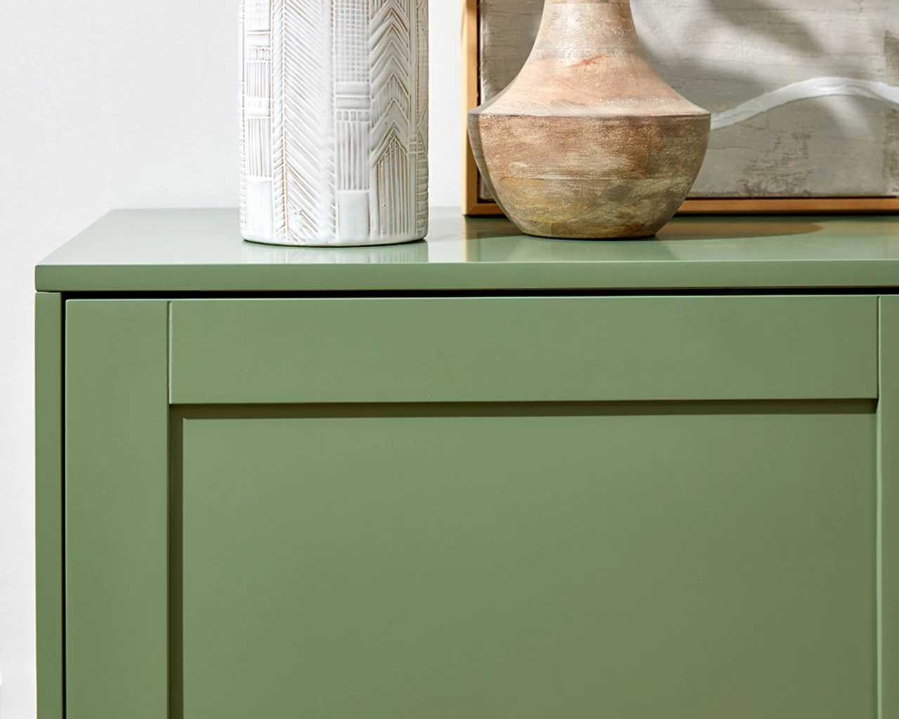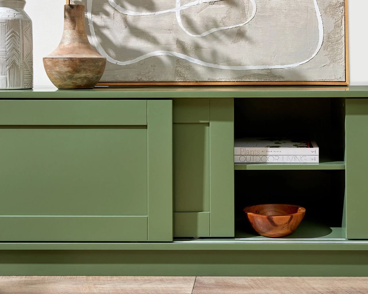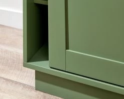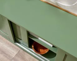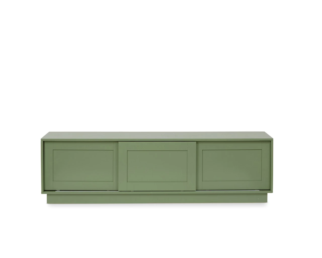 The Eros Entertainment Unit – Sage Green is a contemporary statement for your living room. With shaker style cupboard doors and a sleek profile, this TV unit will suit any lounge room, or media space. The sage green colourway has been chosen for its liveability and elegance, tapping into the trend of bringing the beauty of the outdoors inside and ensuring your home feels calm and stylish. Place this lowline entertainment unit under a wall mounted TV and you’ll have plenty of surface space for a soundbar and your stylish décor. Three cupboards offer essential storage for your entertainment devices, with sliding doors that are easy to access smoothly and quietly.