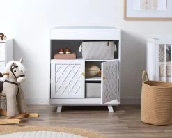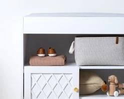The Genevieve Change Table is the ultimate nursery piece to create a serene sanctuary for your baby. With vintage-inspired lattice cross hatching on the cupboard doors and round gold handles, it has a timeless chic design. The soothing white colourway is carefully curated to promote calm and tranquillity while changing your babies’ nappies. This changing table is not only stylish but very functional with a changing tray on top and an open shelf below, perfect for easy-to-reach storage. Need even more storage? Two cupboards at the bottom keep things neat and organised while maintaining that light and calm aesthetic. So, whether you’re designing a nursery from scratch or giving your current space a makeover, the Genevieve Change Table is the perfect addition.