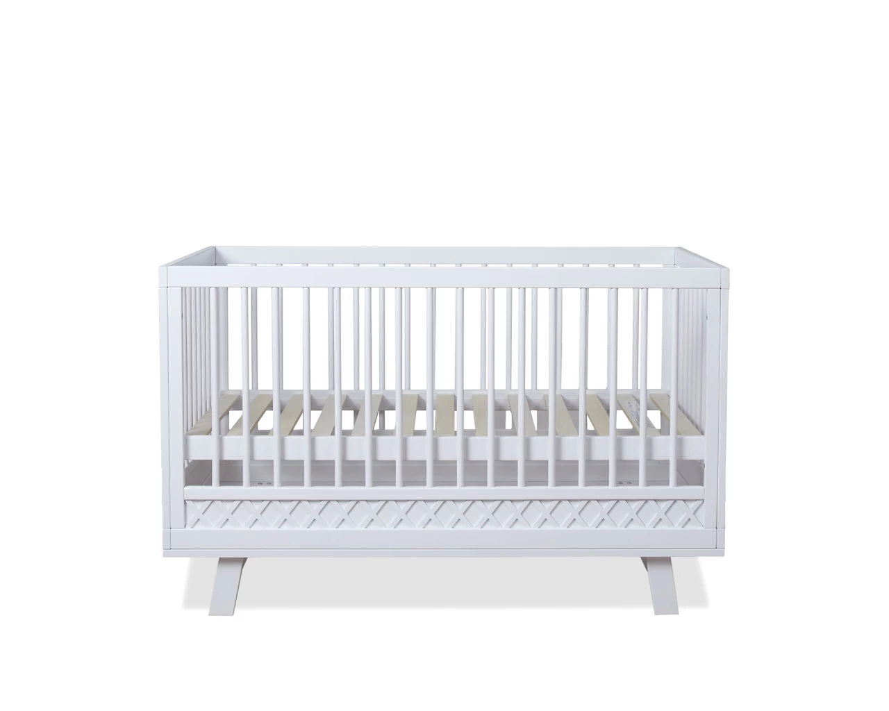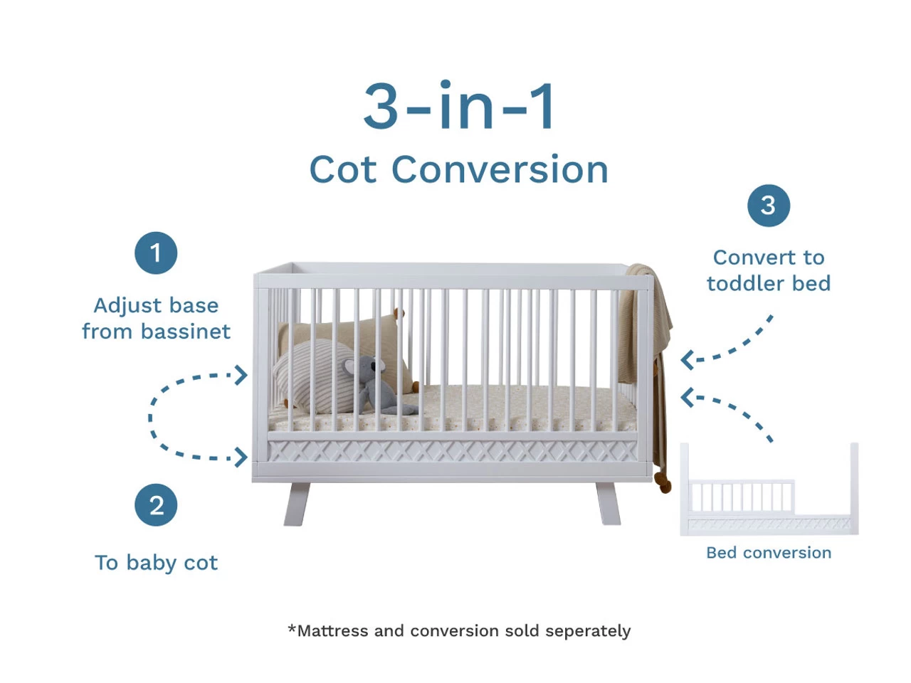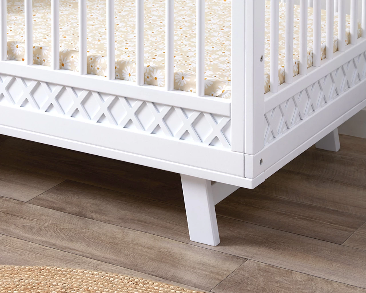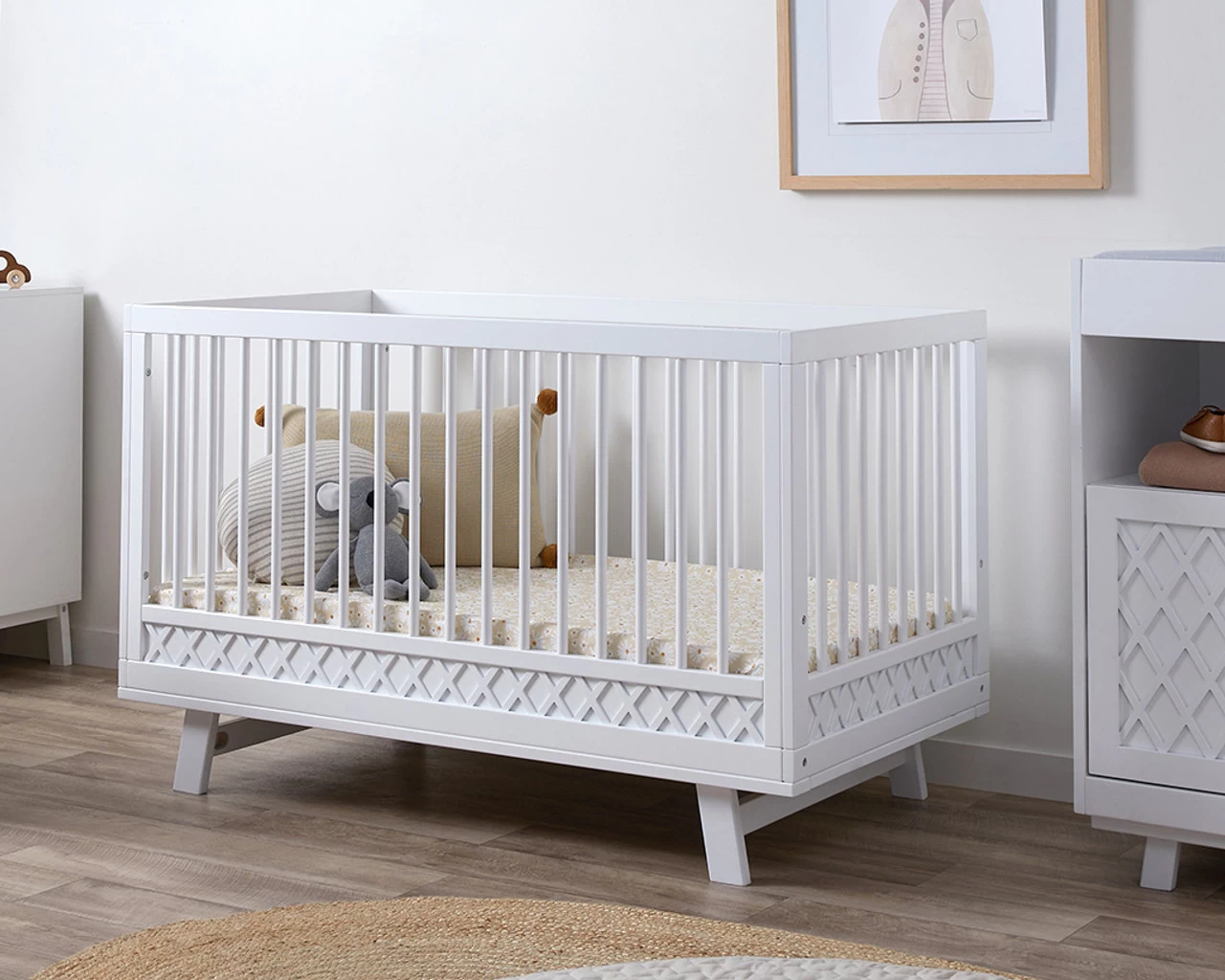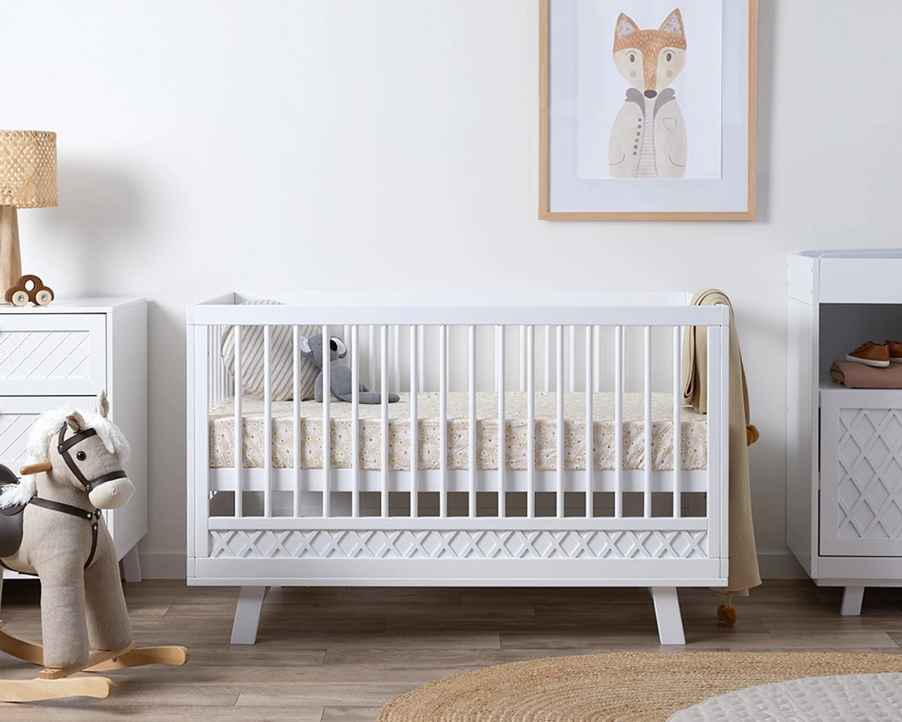 The Genevieve Cot has a timeless design that’ll make your baby’s nursery feel like a true sanctuary. With this cot, it’s all in the details like the decorative lattice trim and spindles on the sides that’s reflective of traditional wood workmanship. Designed to create a sanctuary of calm in your nursery, this cot has a soft white colourway and a mix of textures to promote relaxation and sleep.