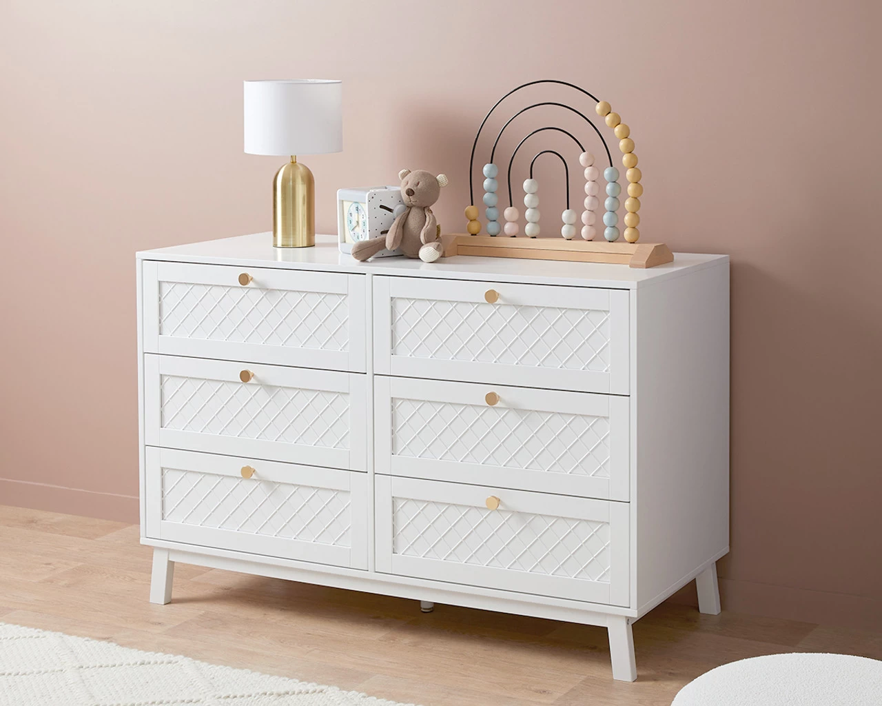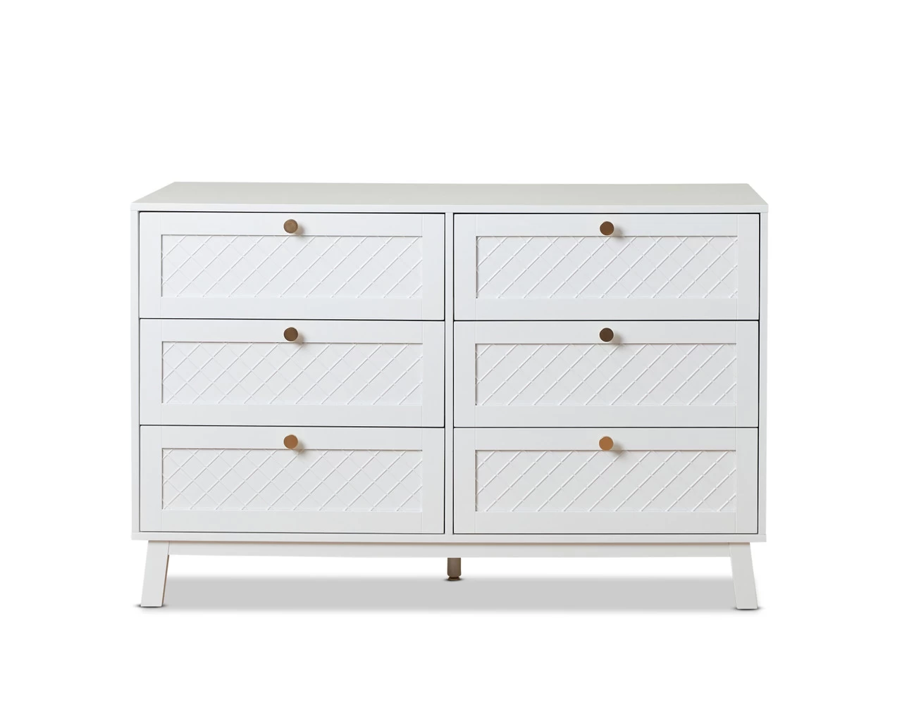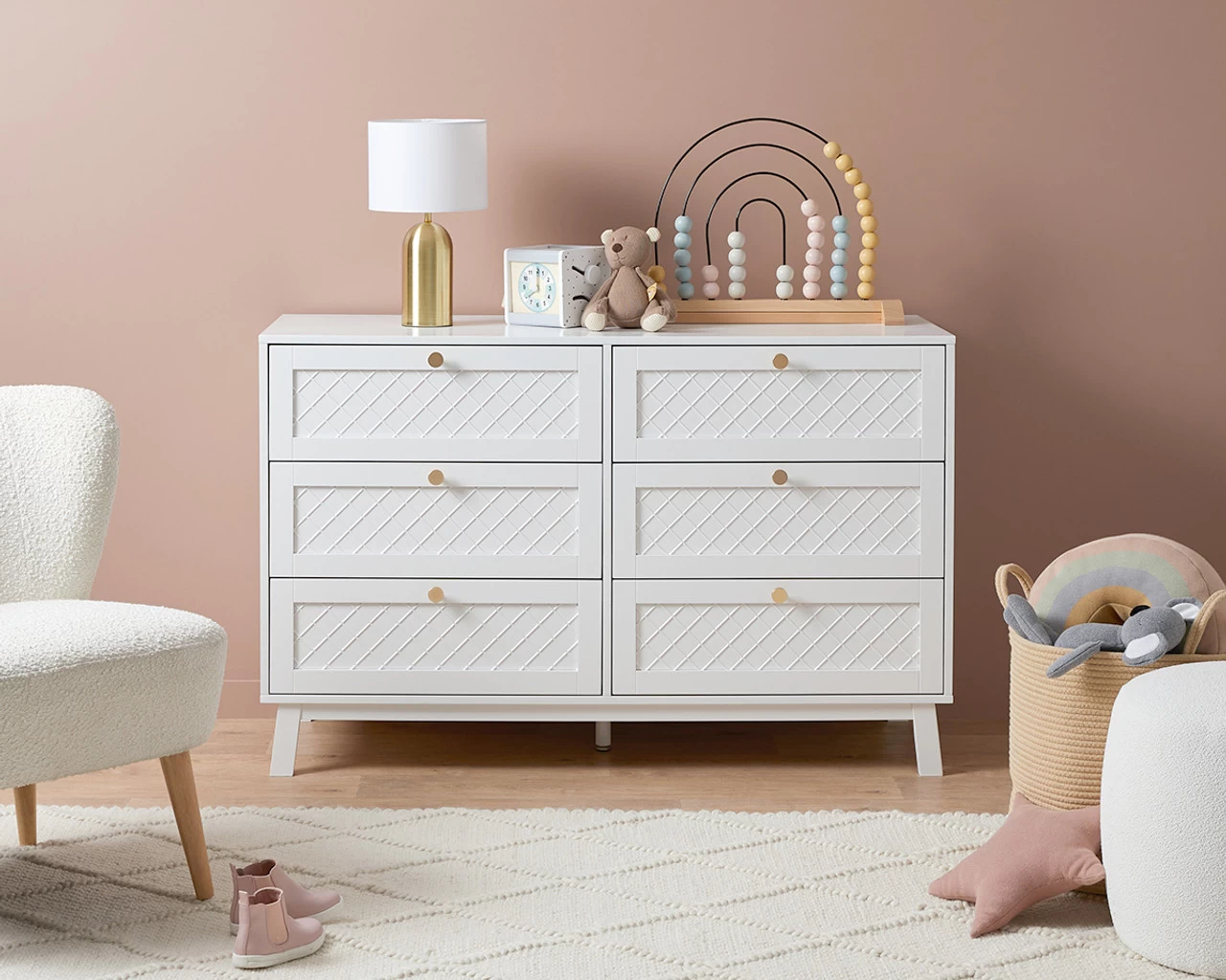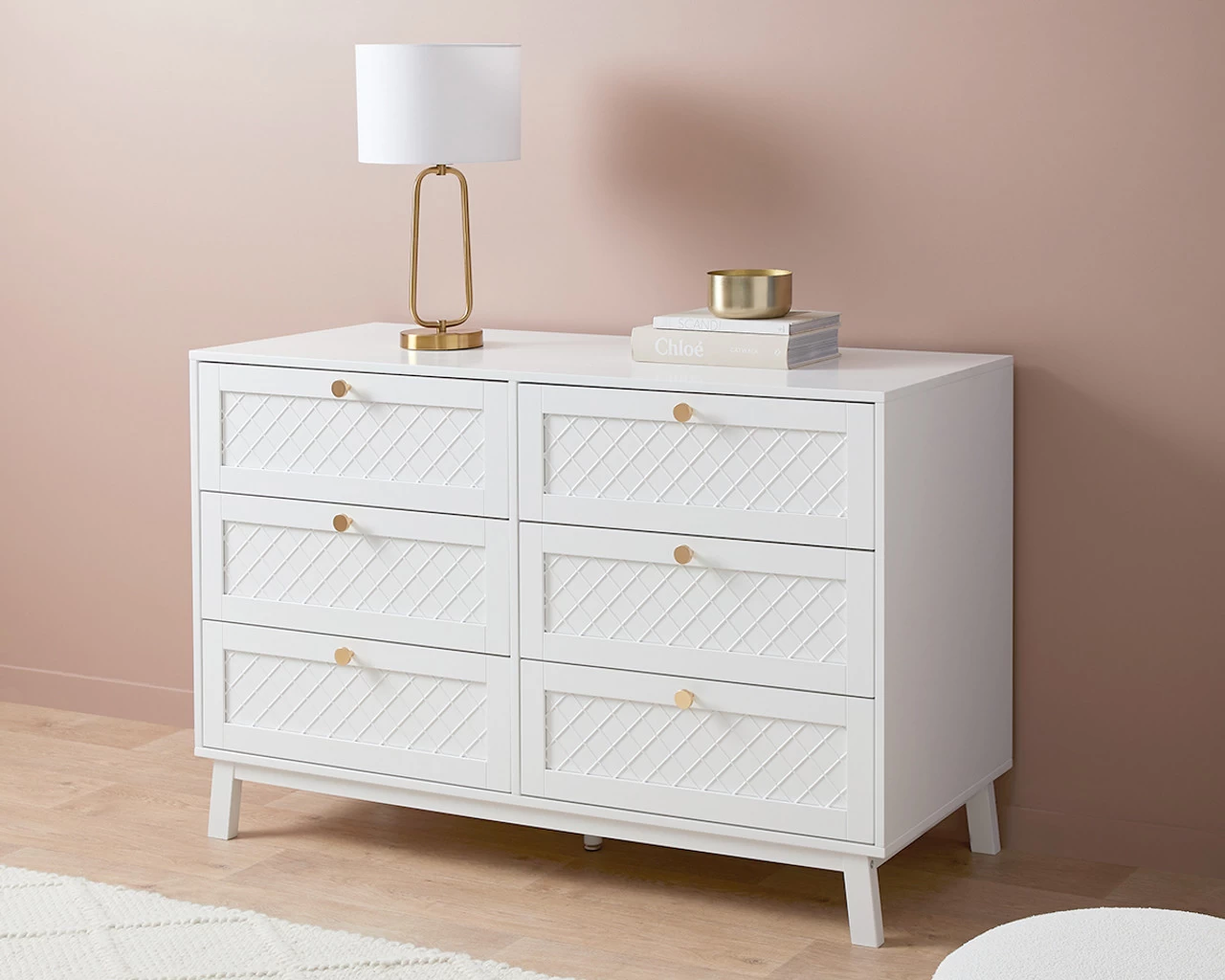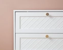 The Genevieve Six Drawer is the perfect combination of classic and traditional design, with a hint of Hamptons criss-cross detailing on the front drawer panels. Each drawer is adorned with a round, gold handle that is bang on-trend and gives this drawer a touch of chic glamour. Ideal as a dresser and chest of drawers in a bedroom or nursery, or as a buffet unit in a dining room or living space, the timeless look creates a calm, sanctuary perfect for sleep or relaxation. Designed to create a beautiful and functional space, the six sliding drawers are perfect for tucking away all your clutter, making organising a breeze. It looks stunning styled under a mirror, artwork, or window and the flat surface is perfect for displaying your favourite decor.
