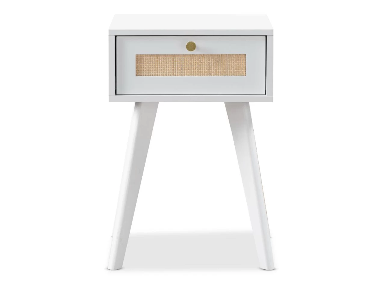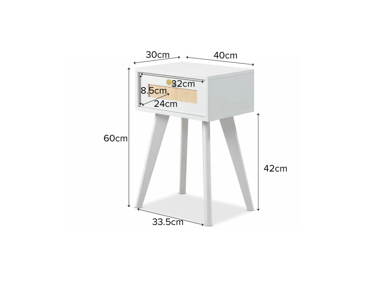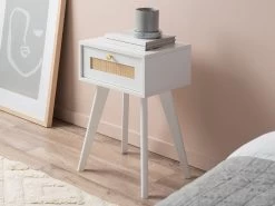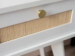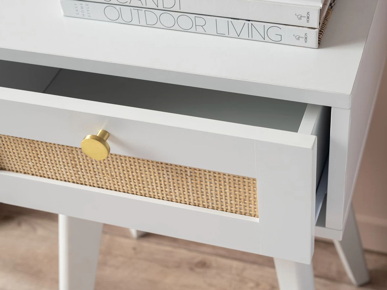 Featuring bright white cabinetry that really showcases the natural, organic beauty of the weaved rattan panel in the centre of the drawer front, this side table would easily suit chic bohemian, coastal or Scandinavian living. Paired with a brushed gold handles, round handle, this bedside table will feel like a luxury in your master bedroom, guest bedroom or living spaces.,
