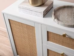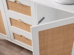 The Georgia Buffet adds light and bright style to your dining area. Featuring three drawers and two spacious cupboards, this all-purpose storage unit will keep your home essentials tidy and organised. Perfect for the dining room, living room or bedroom, this buffet unit is super versatile. Wonderfully on-trend, this buffet cabinet pairs a bright white frame with natural rattan drawer panels. Each drawer is embellished with a brushed gold circular handle that adds a luxe element to the overall design.