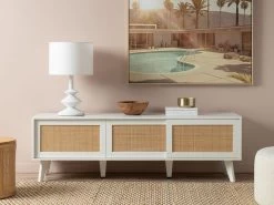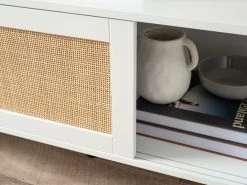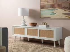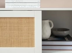Add stunning coastal style to your living spaces with the Georgia Entertainment Unit – Large. With a generous 160cm length, this is the perfect statement entertainment unit for a living room or media room. The spacious surface and three sliding door compartments give any home versatile storage and display space and works well placed under a wall-mounted TV or large piece of artwork. We love the pairing of a painted, white frame with real rattan weaved panels for a light and bright look that adds natural texture to a space.