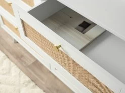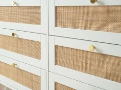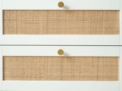 Working well with most interior styles, including bohemian, coastal or Scandinavian, this chest of drawers features bright white cabinetry that really showcases the natural, organic beauty of the weaved rattan panels in the centre of the drawer fronts. This touch of natural texture brings the outdoors inside for more warm and expansive spaces. Paired with brushed gold circular handles, this six drawer cabinet will feel like a luxury in your bedroom, nursery or living space.