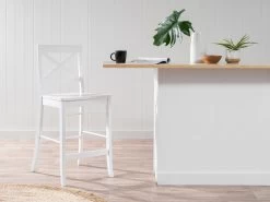 Give your bar or breakfast bench timeless style with our Hamptons Bar Stool – White. Perfect for the kitchen bench, island or your home bar, this wooden bar stool gives your home an effortlessly chic style. Featuring a lovely cross backrest which offers ultimate Hamptons style with a touch of French provincial, this bar seat creates a relaxed yet sophisticated style. Ideal for entertaining and informal dining, you’ll love the high back and footrest for everyday comfort.
