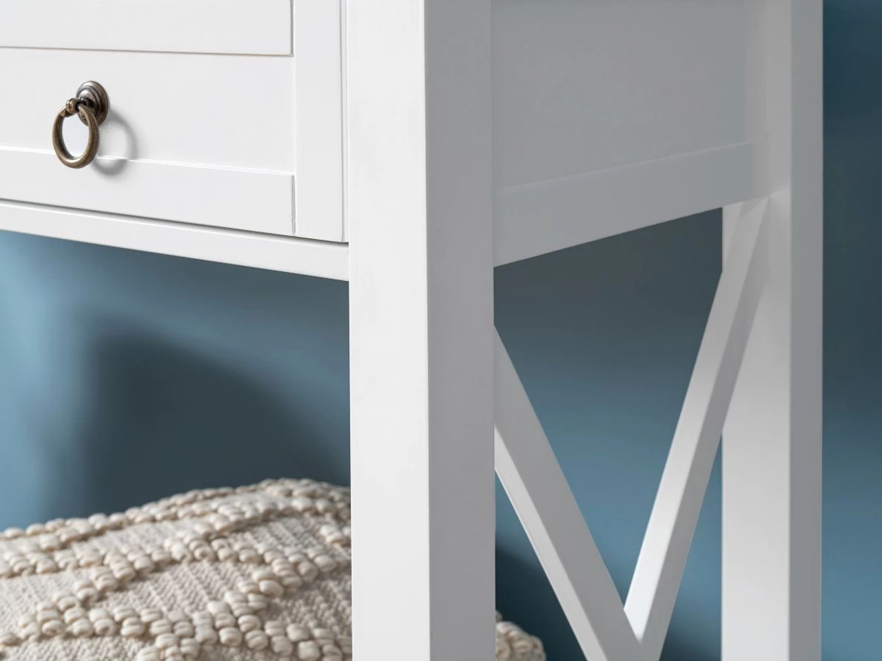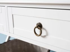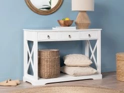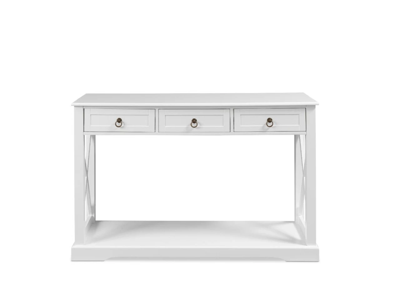 Create a Hamptons-inspired entryway with the Hamptons Console Table. This hall table looks stunning when placed in an entryway, hallway or living space and will provide an elegant welcome to your home. Featuring three sliding drawers, a spacious surface and bottom shelf, you’ll have multiple storage and display options for the home. The statement cross side panels and metal ring drawer handles really give this entryway table the elegant Hamptons style. Finished in a simple white, this console table is classic and sophisticated, yet still has a fresh, relaxed style reminiscent of coastal places.