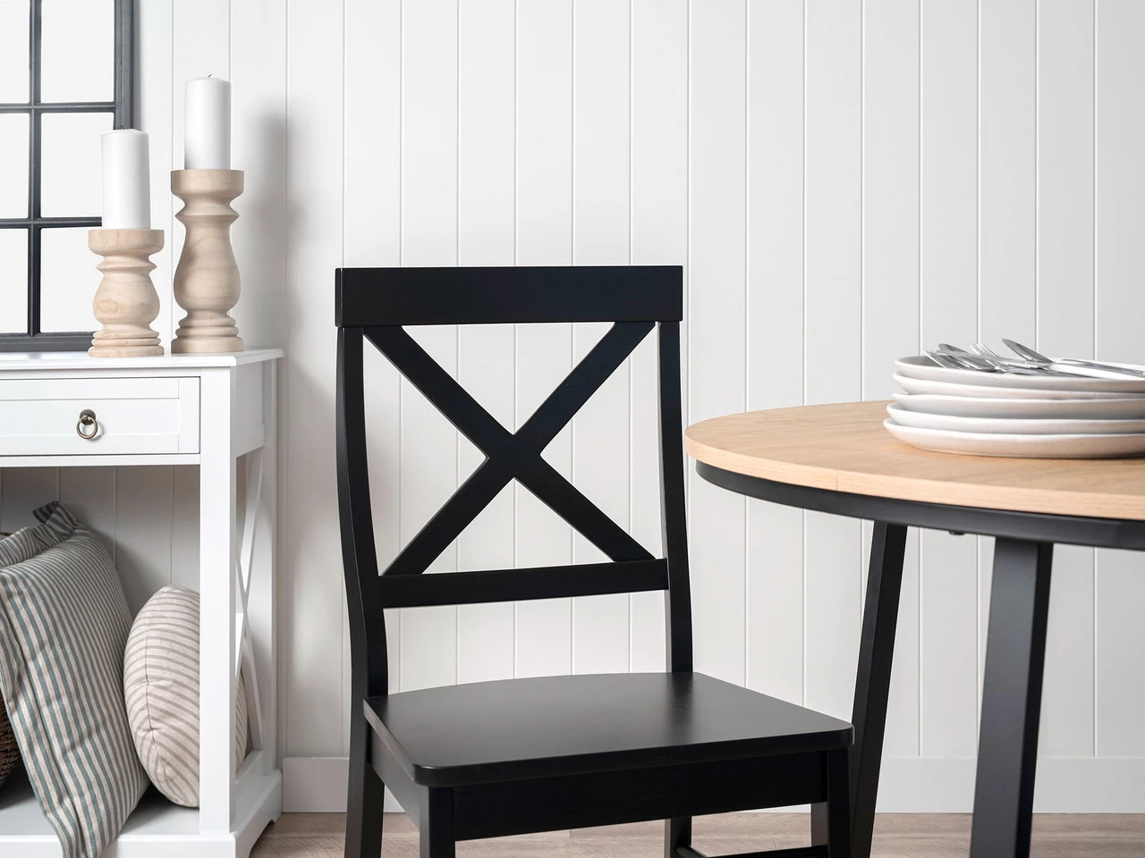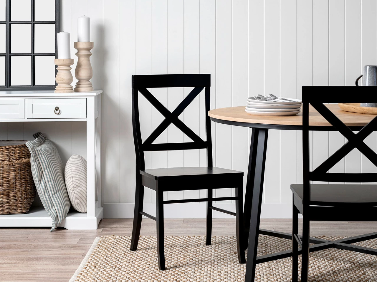 Bring relaxed, black design to your dining table with our Hamptons Dining Chair – Black. This cross back dining chair is super stylish, while remaining highly functional for busy families. The durable legs provide all-round sturdy support, while the high backrest perfectly supports you as you dine so you stay comfortable no matter how long you linger over dinner.