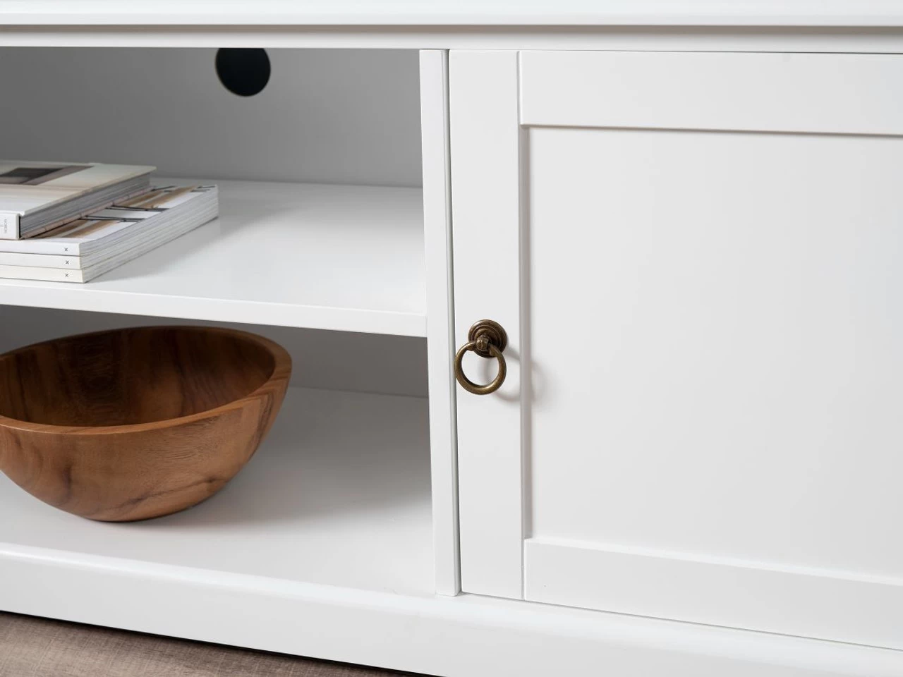 Create Hamptons style in your lounge or media room with the Hamptons Entertainment Unit. With an elegant shape and beautiful details, this TV unit comes in a stunning white finish with metal ring handles for a look that is both relaxed and elegant. You’ll have plenty of space for any devices with two centre shelves, which comes complete with a hole in the back panel for cords. Paired with two cupboards, there is useful storage to tidy away other essentials and keep your living room effortlessly uncluttered.