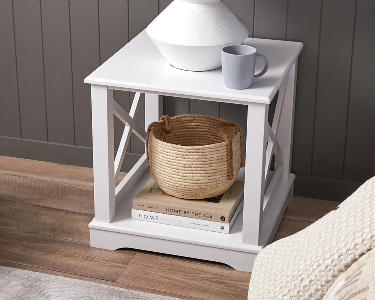 The Hamptons Side Table provides easy Hamptons style for any home or budget. Whether used as a bedside table in a bedroom or as a side table next to a sofa, lounge or armchair, this side table will hold everything from your morning cuppa and your night-time read, to décor like plants, lamps and more. Featuring an open design and two storage surfaces, you can make use of each for all your style and storage needs.