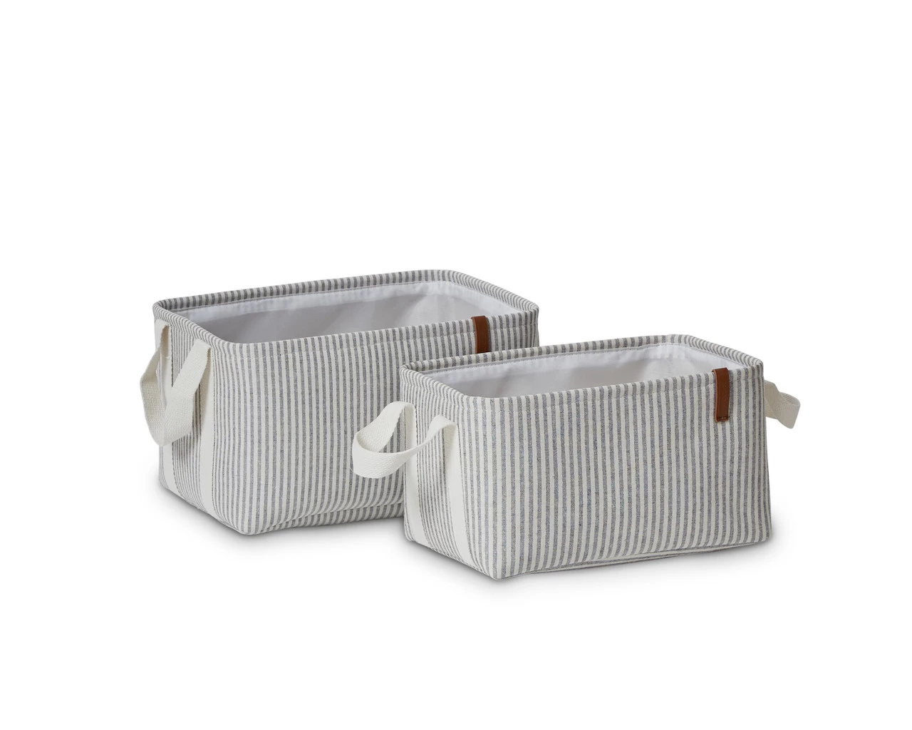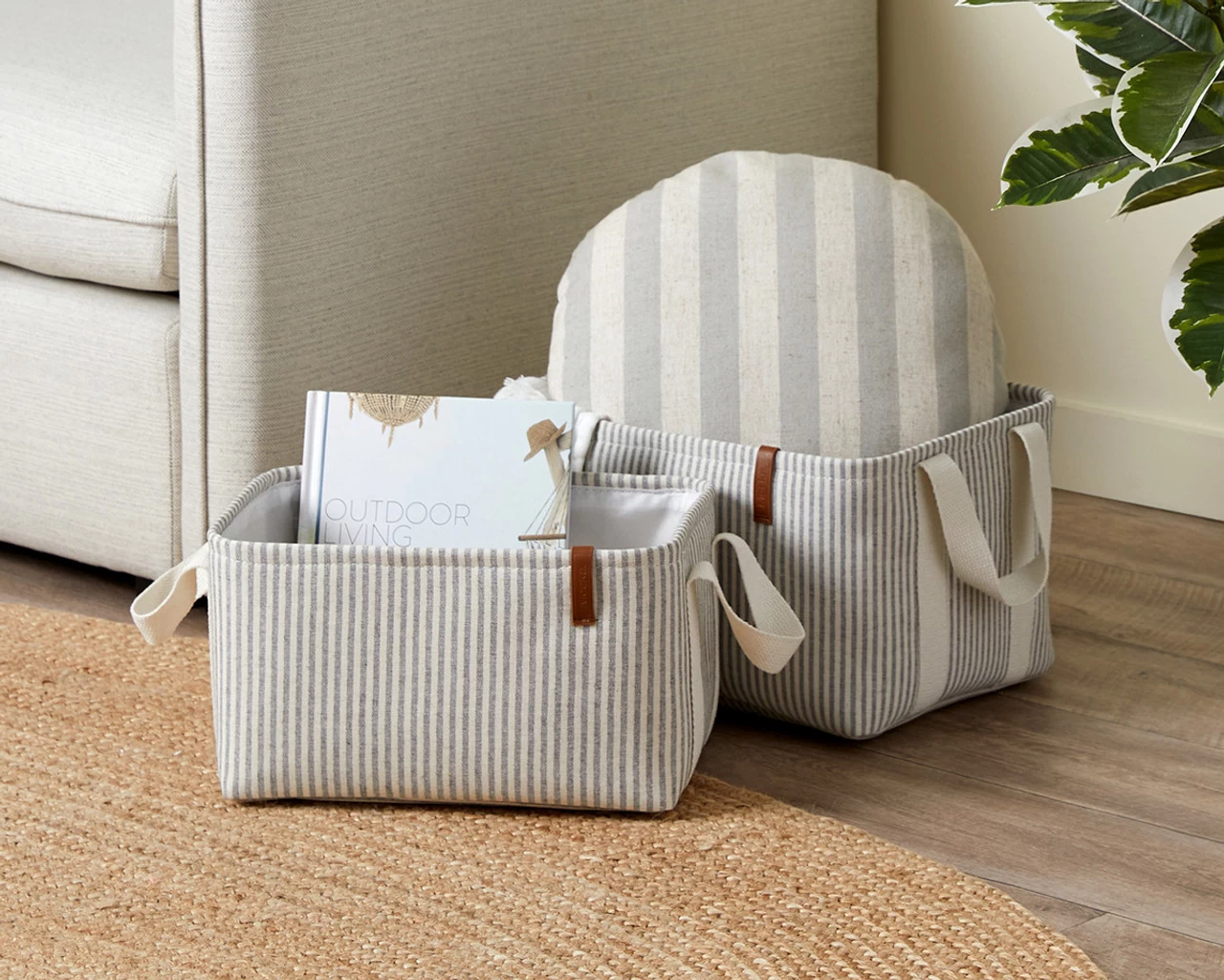 Organise your home in elegant style with the Hamptons Stripe Storage Baskets – Set of 2. Perfect for small storage in the laundry, linen cupboard, wardrobe and throughout the home, these fabric basics are soft on whatever you need to store. A great way to reduce clutter in your home, their rectangle shapes fit easily on shelves. Practical and stylish, the Hampton-inspired stripe fabric in a grey and white colourway will make your home feel chic and elegant. Available as a set of two, with slightly different sizes, you can style them together as a pair or separately.