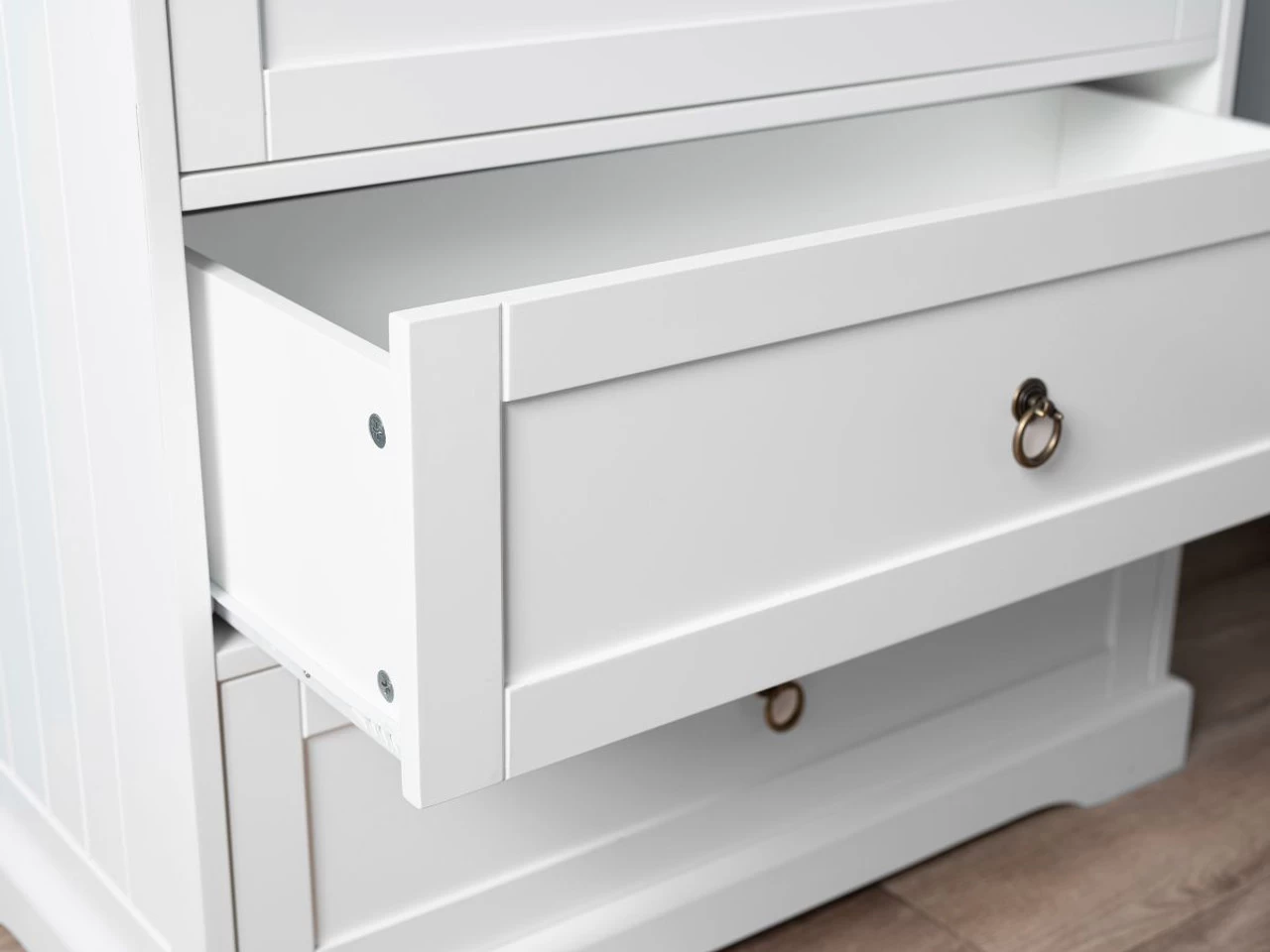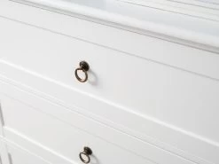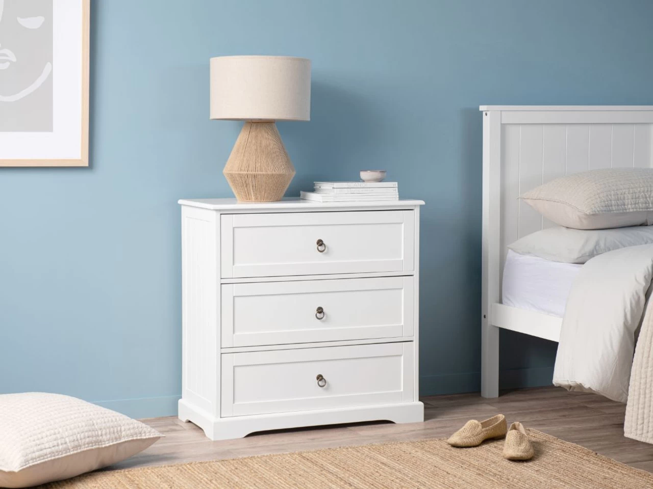 The Hamptons Three Drawer will add classic Hamptons style to your bedroom. With an elegant shape and fine details, this three drawer dresser offers extra drawer space in a nursery, master, guest or kids bedroom. Featuring three, sliding drawers, this Hamptons style chest of drawers is perfect for storing your clothes and other essentials. Available in a stunning white colour accented with metal ring handles and VJ panelled sides, you’ll love the elegance this unit brings to a room.