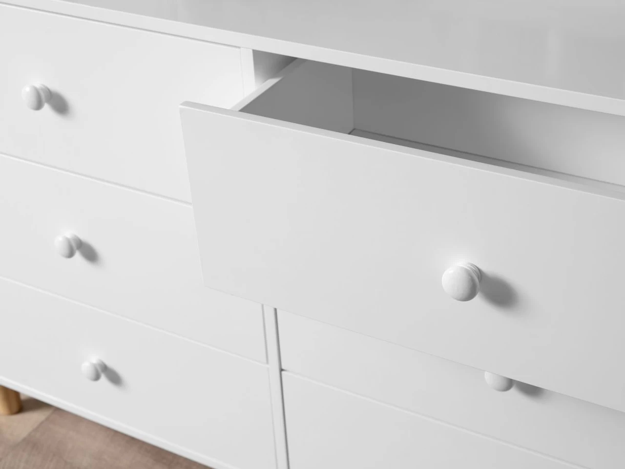 We love the classic dresser shape and round, knob handles which gives this six-drawer cabinet a traditional look. The all white, matte finish is simple and modern and ensures this dresser will suit any interior décor. If you love this chest of drawers, then be sure to check out the rest of the Hobart range. Add simple bedroom storage to your home with the Hobart Six Drawer.