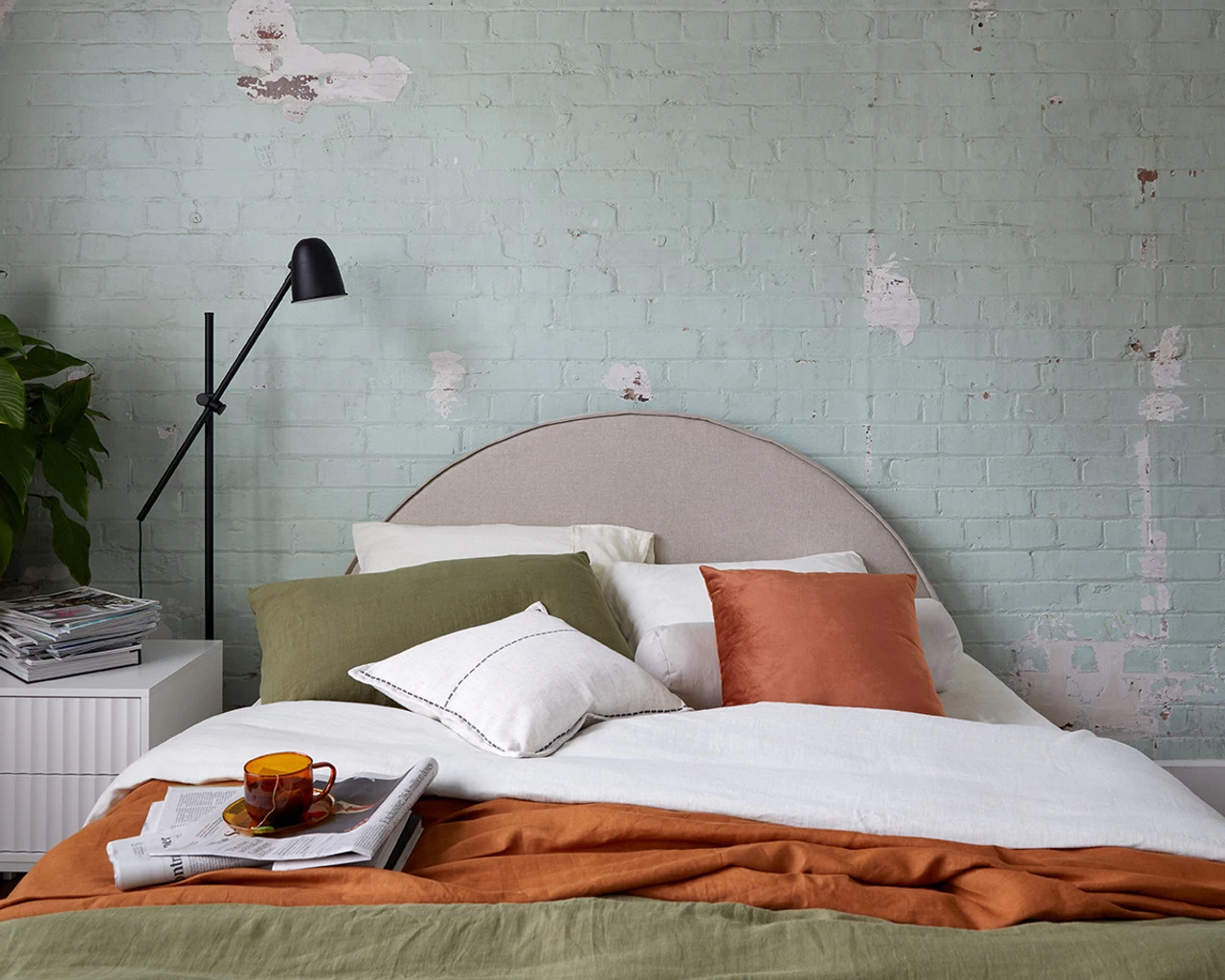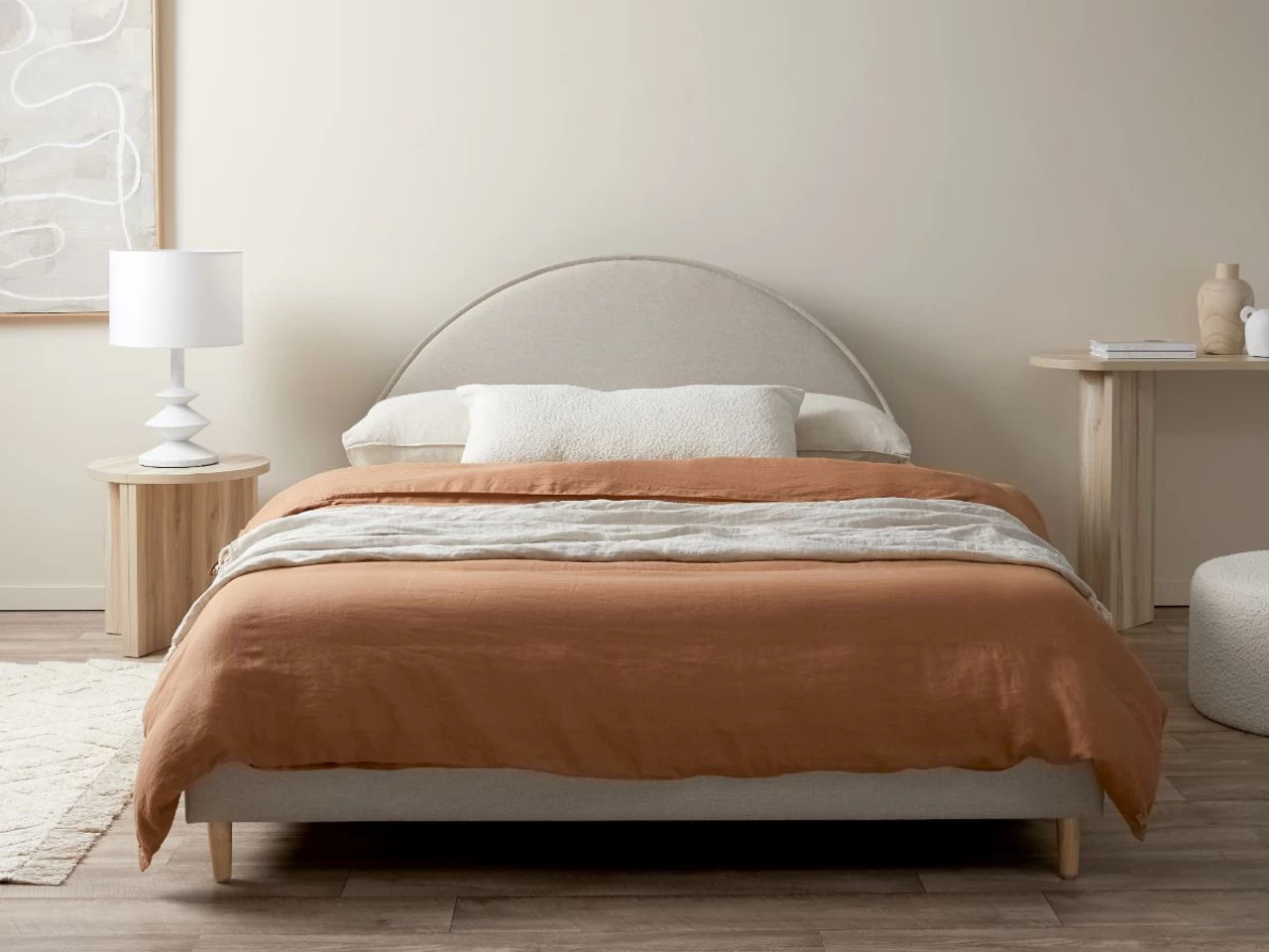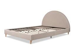 accommodation, this neutral, upholstered, queen bed frame is beautiful in its simplicity. Featuring a curved, arch headboard and upholstered frame, you’ll love the statement this bed adds to a room. We love the muted, natural colourway which gives this queen bed a timeless style and is the perfect neutral backdrop for bedding and décor. Pair with natural textiles like linen and bamboo for a dreamy, elegant bed to relax and sleep in.