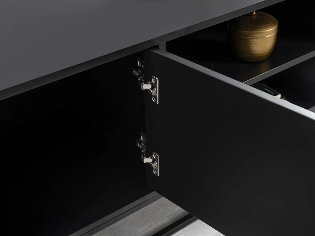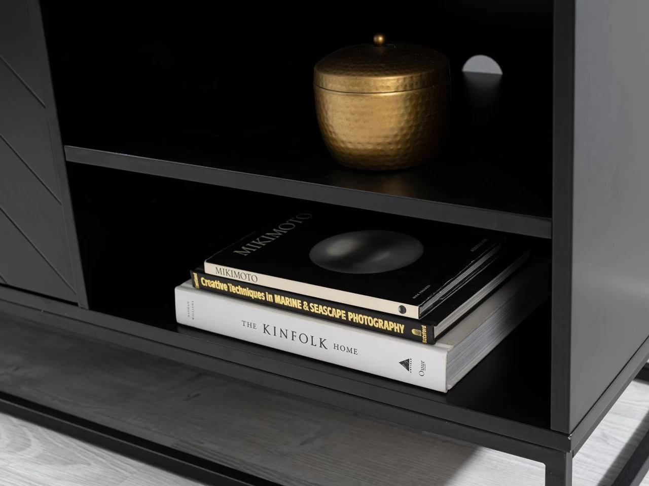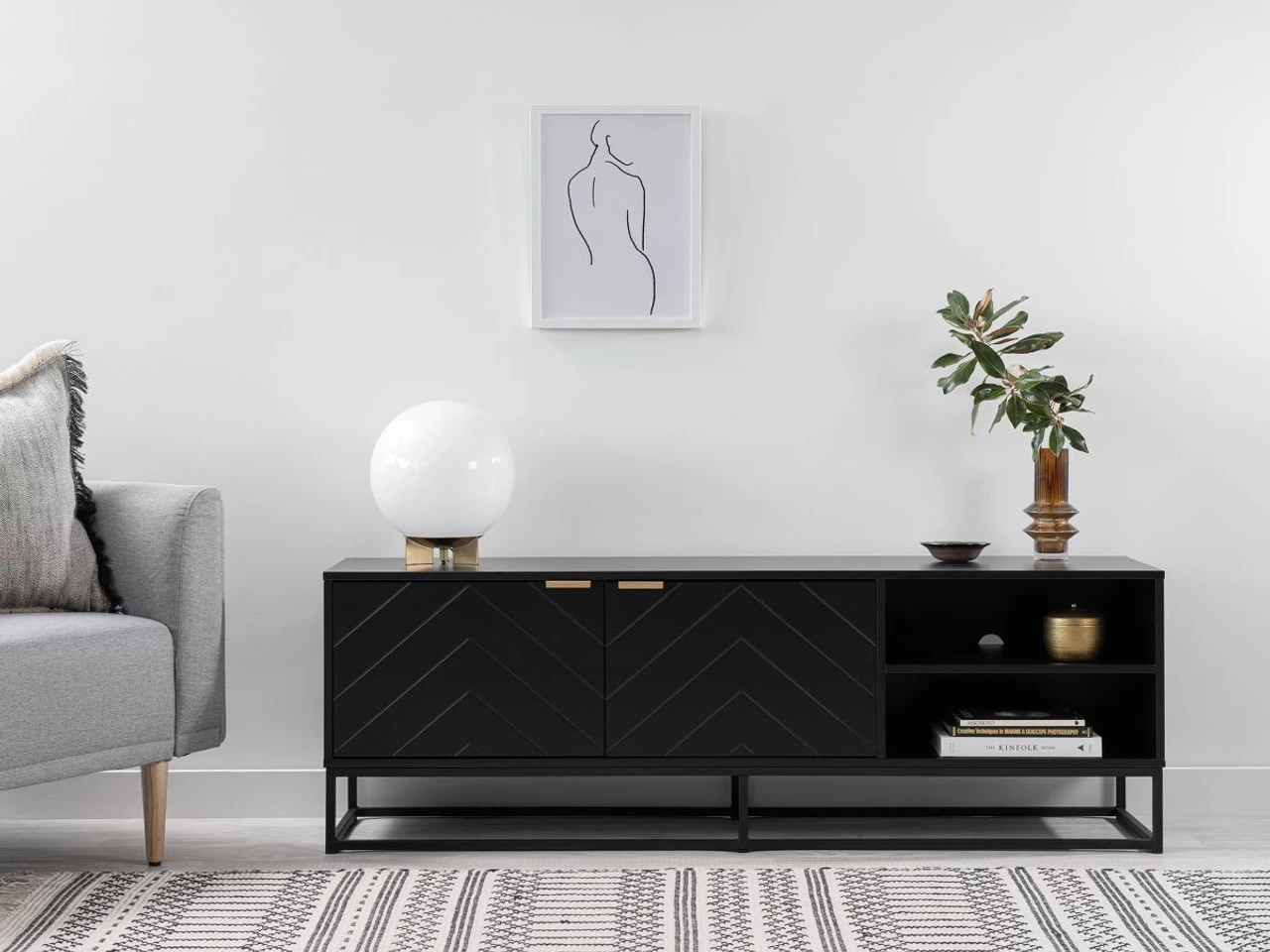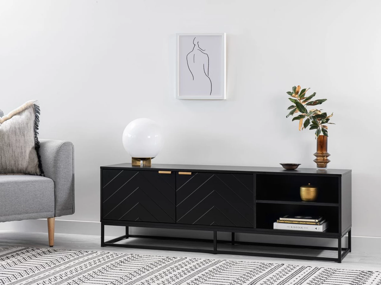 Bold and luxe, the Inca Entertainment Unit – Black offers black and gold styling to transform your lounge and living spaces. Boasting a mix of closed cupboard space and open shelves, this unit has versatile storage options for a console or devices and your favourite décor. With a lot of the storage hidden behind cupboard doors, you can easily keep your living room streamlined and clutter- free. Our favourite feature is the holes in the back panels for keeping cords neat and tidy. You’ll love the monochrome design with black metal legs, gold handles and subtle design features on the cupboard doors.