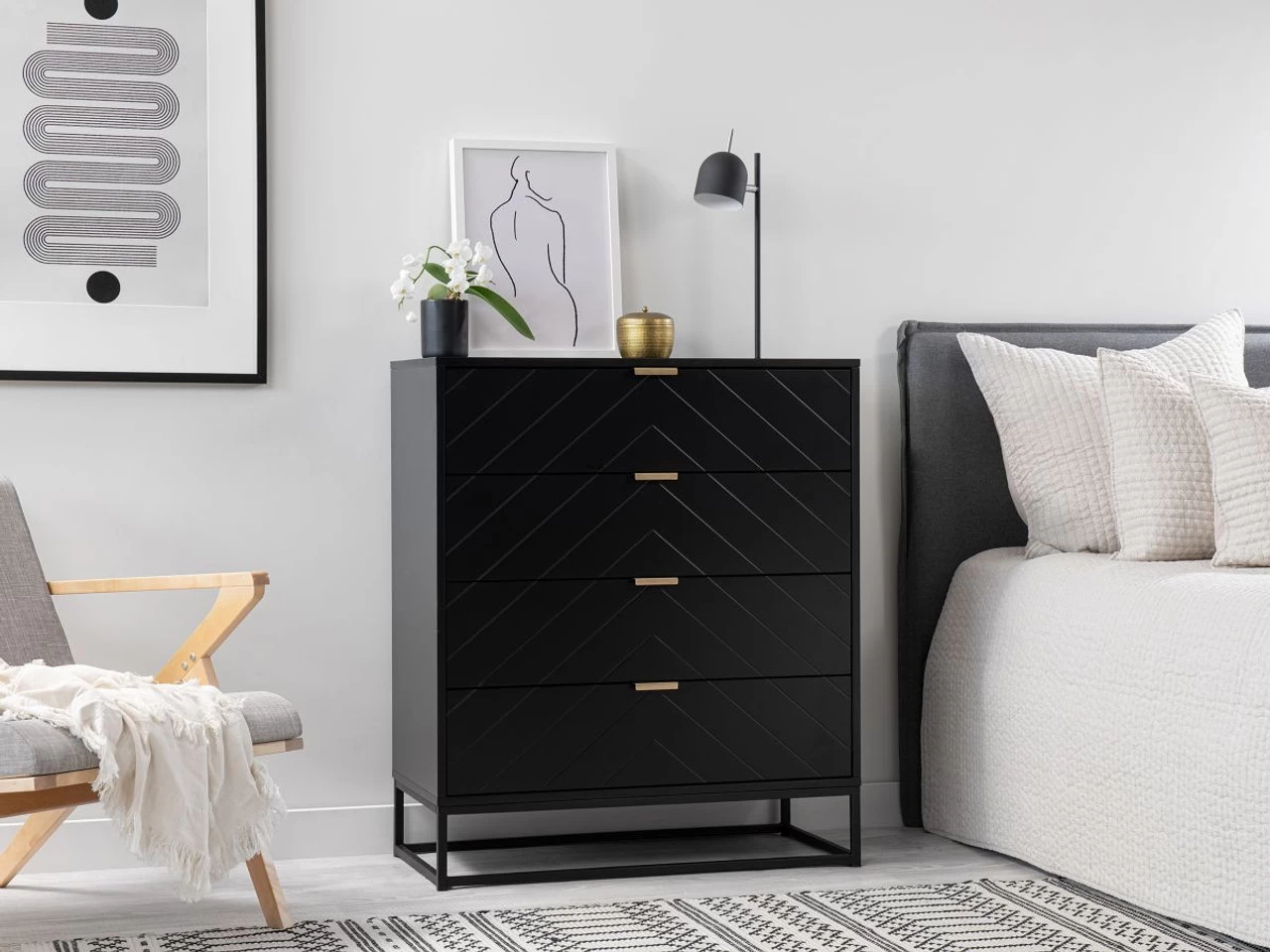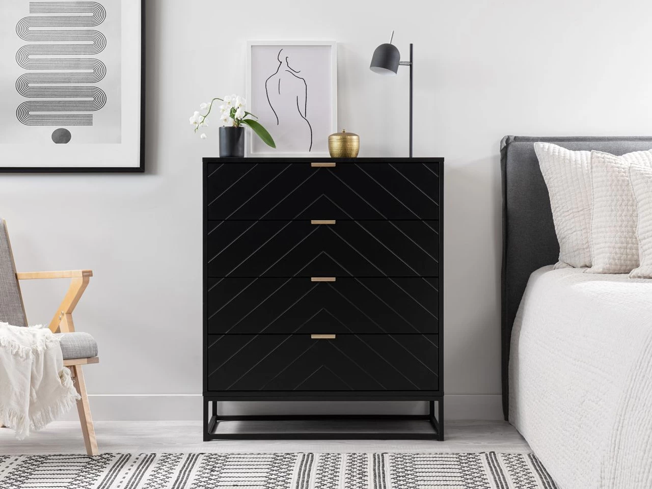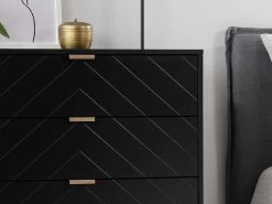 Add style modern, luxe style into your home storage with the Inca Four Drawer – Black. Perfect for the bedroom, living room or office, this mid-sized dresser has four spacious drawers perfect for storage and organisation. A versatile option, you can use this unit for clothes storage, accessories and household essentials. We love the chic, monochrome design, black metal legs, gold handles and subtle design feature on the drawer fronts, for a bold and luxe style that will instantly transform your home style.