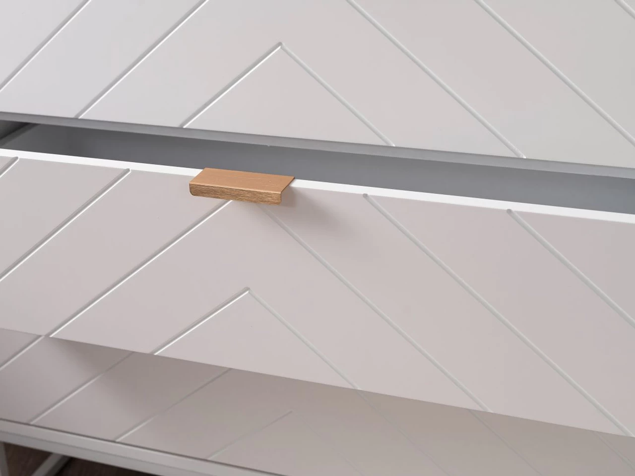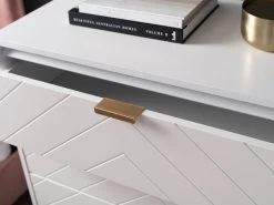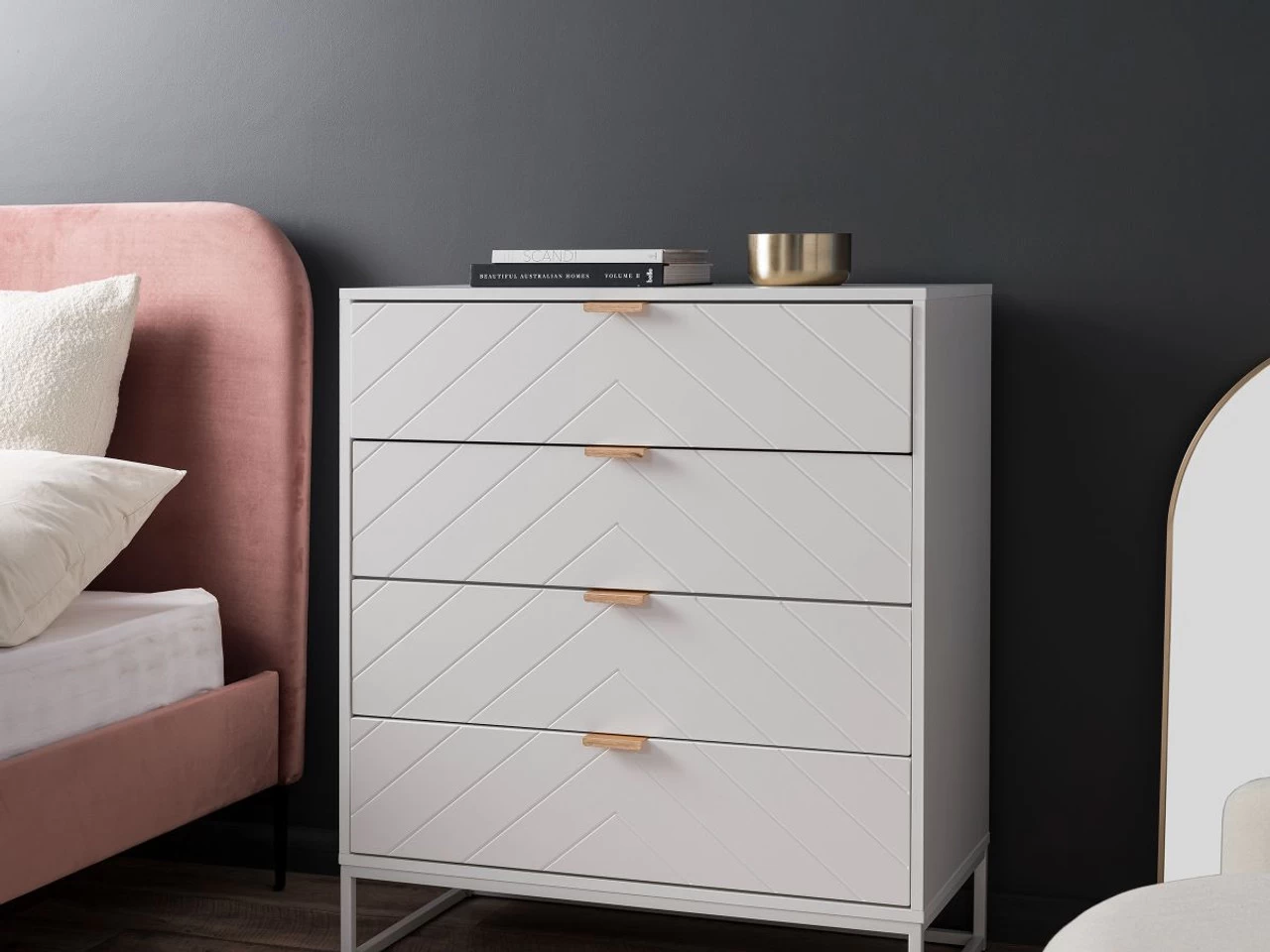 The Inca Four Drawer is a white chest of drawers with stunning, luxe style. Perfect for the bedroom or nursery, this mid-sized dresser has four spacious drawers for storage and organisation and is an easy way to maximise the storage space in your home. Each drawer has a sliding metal rail, which makes using this unit effortless and would suit as storage for clothes, accessories, and household essentials. The tall design makes this a good option for a mid-sized tallboy that won’t take up too much space in a room. We love the subtle, engraved pattern on the drawer fronts which adds stunning texture and interest to a space. The neutral bright, white finish, accented with rose gold handle details, gives this four-drawer unit a luxe yet timeless style you’ll adore in any bedroom.