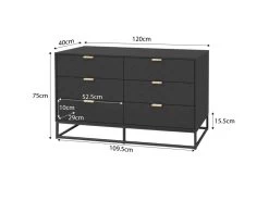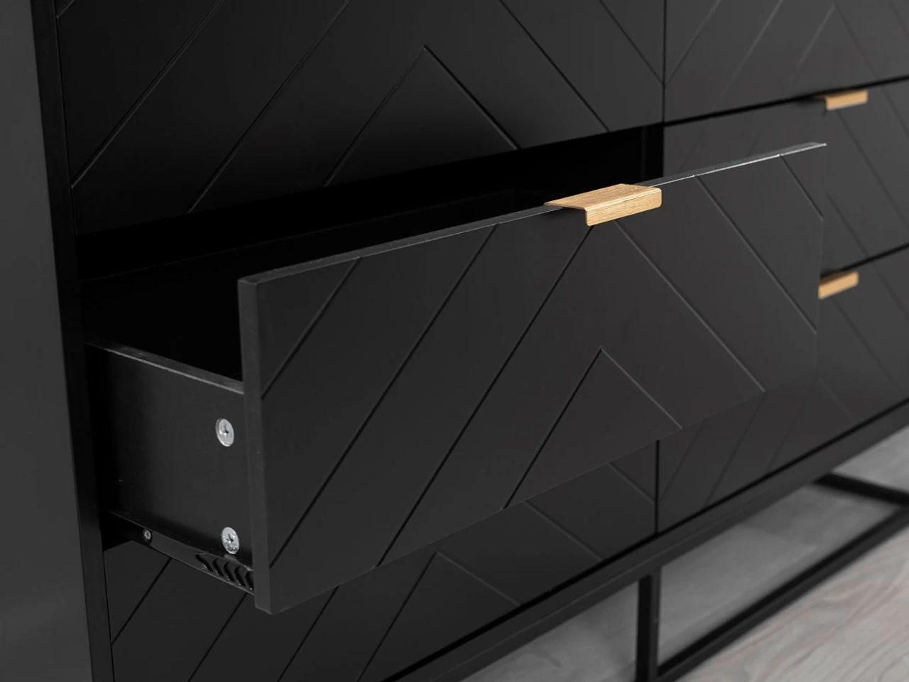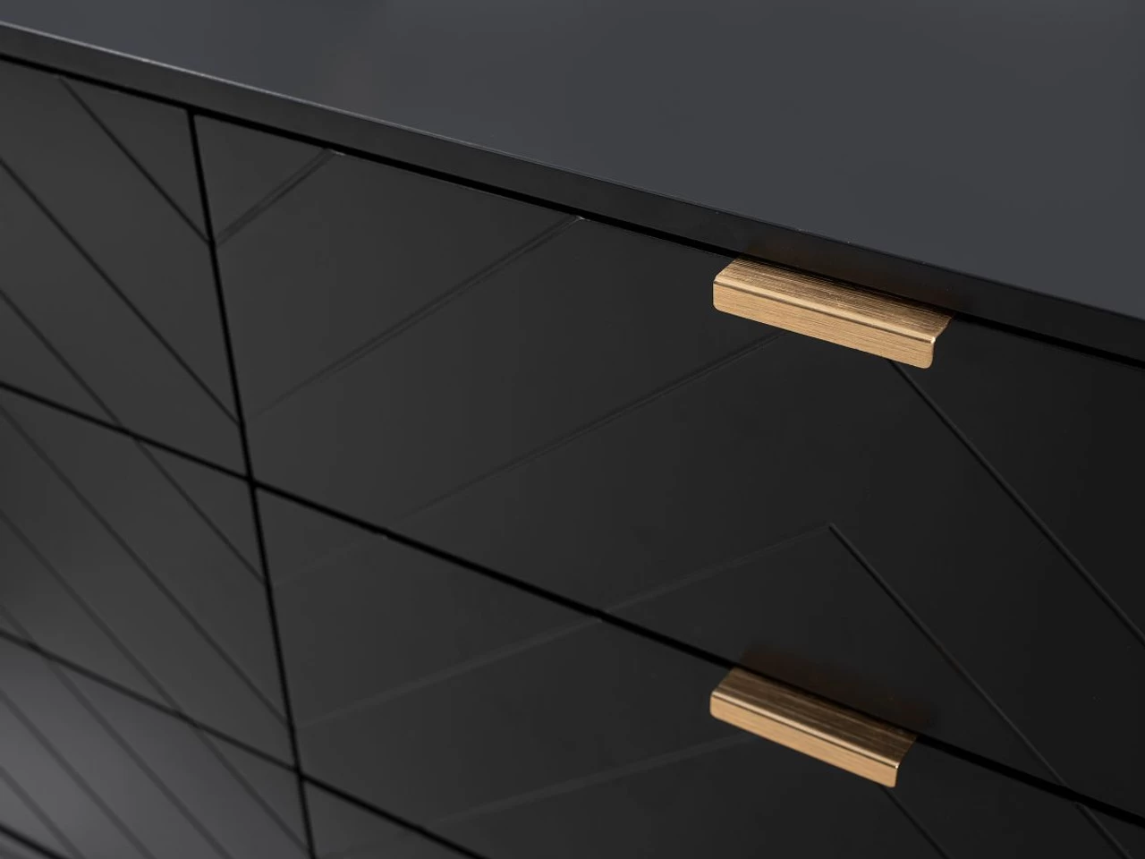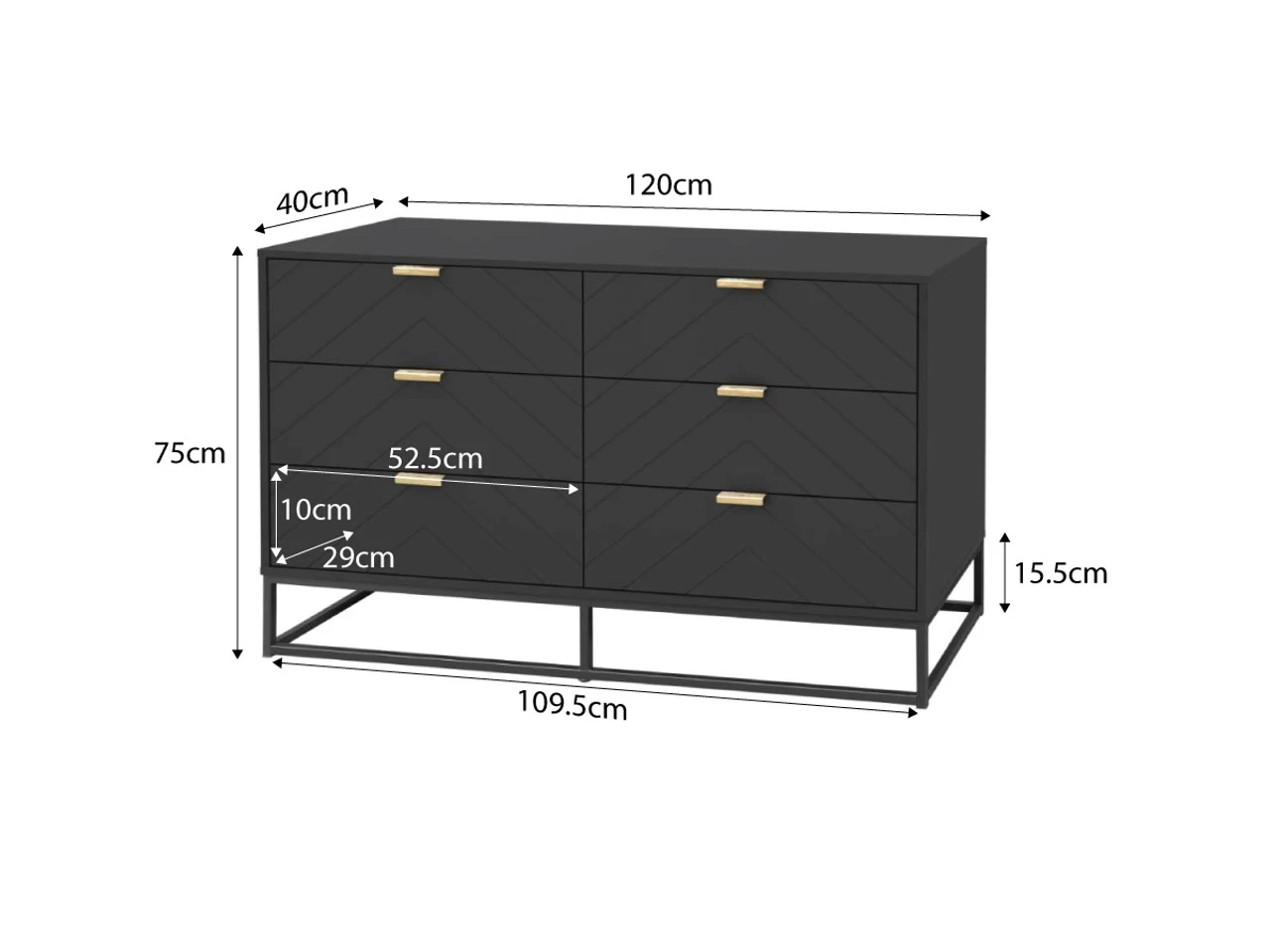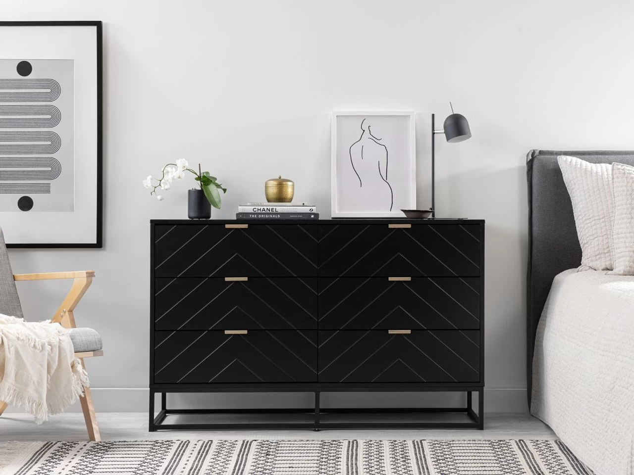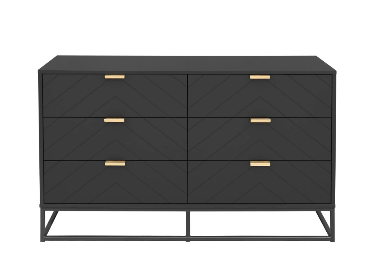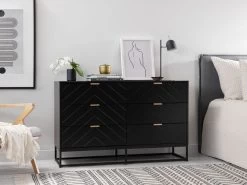 The Inca Six Drawer – Black adds abundant storage options to your home. With six large and spacious drawers, this unit is bursting with useful storage for the bedroom, dining room, nursery, living space and more. With a large chest of drawers, you’ll easily keep your home tidy and clutter-free. We love the chic, monochrome design, black metal legs, gold handles and subtle design feature on the drawer fronts, for a bold and luxe style that will instantly transform your home.