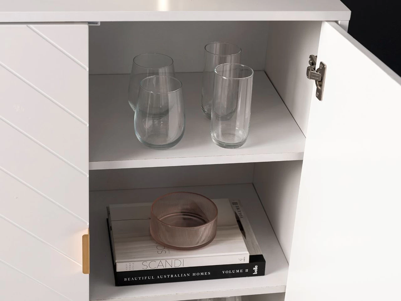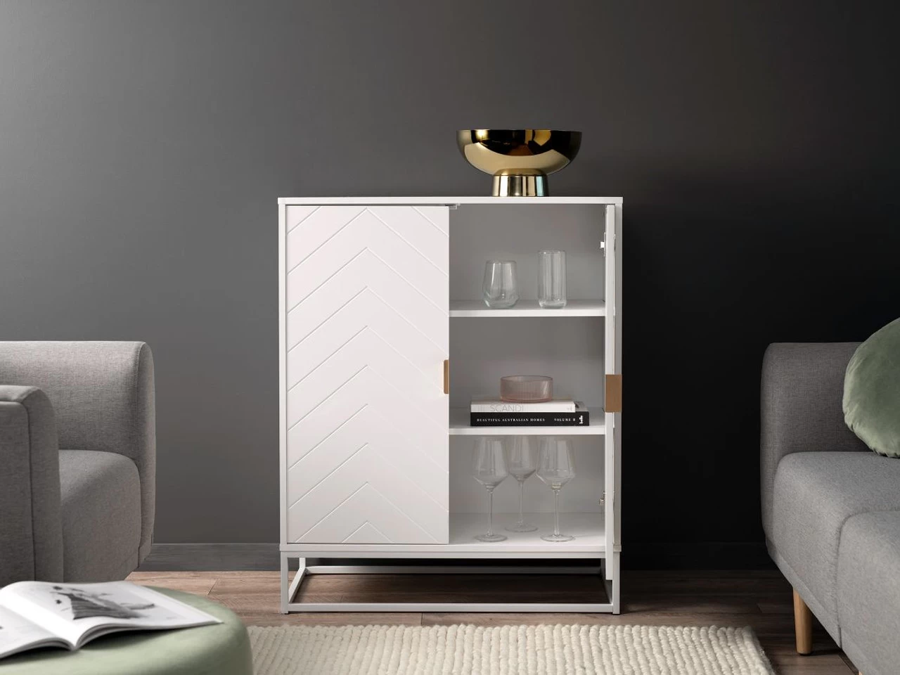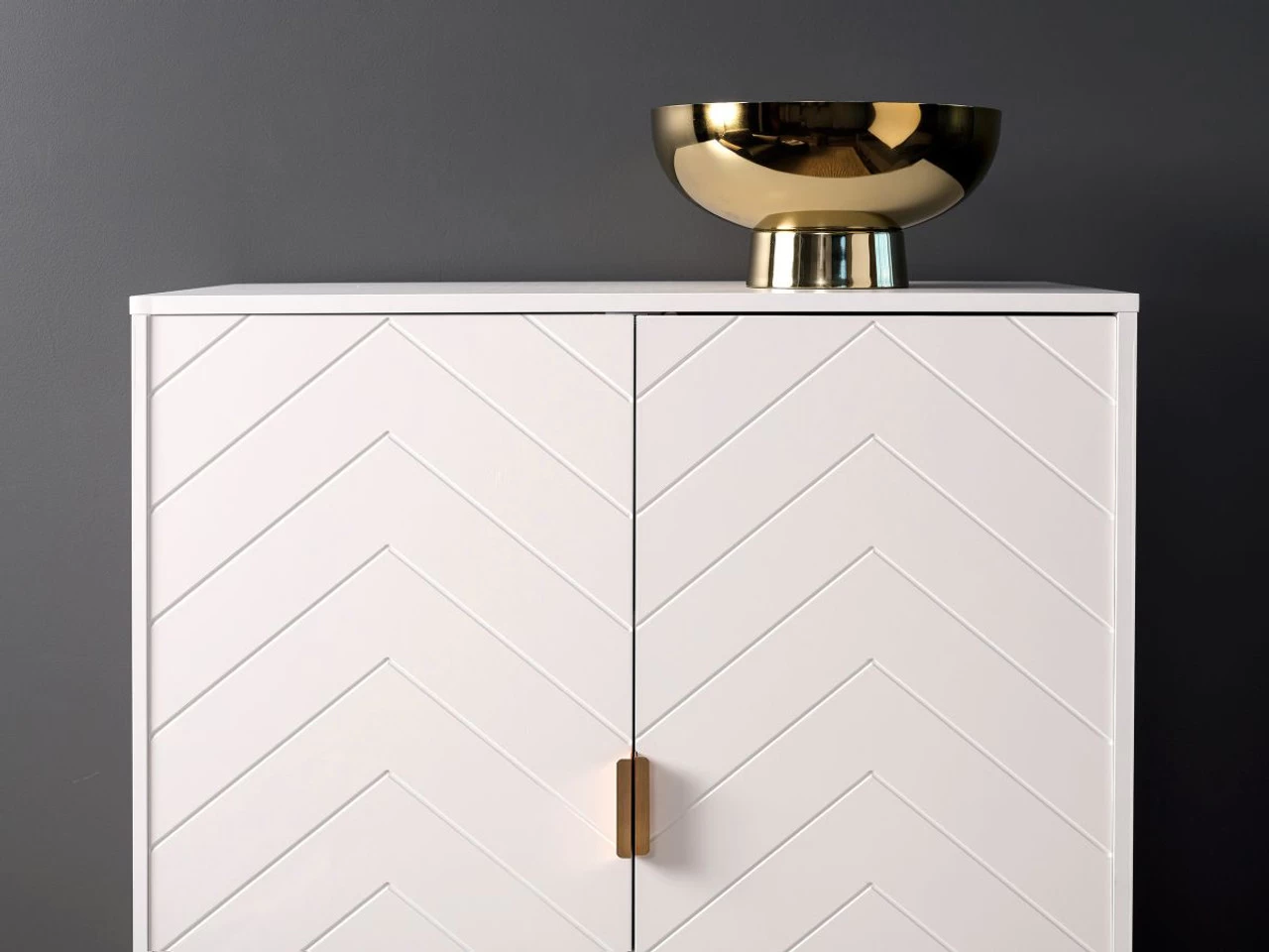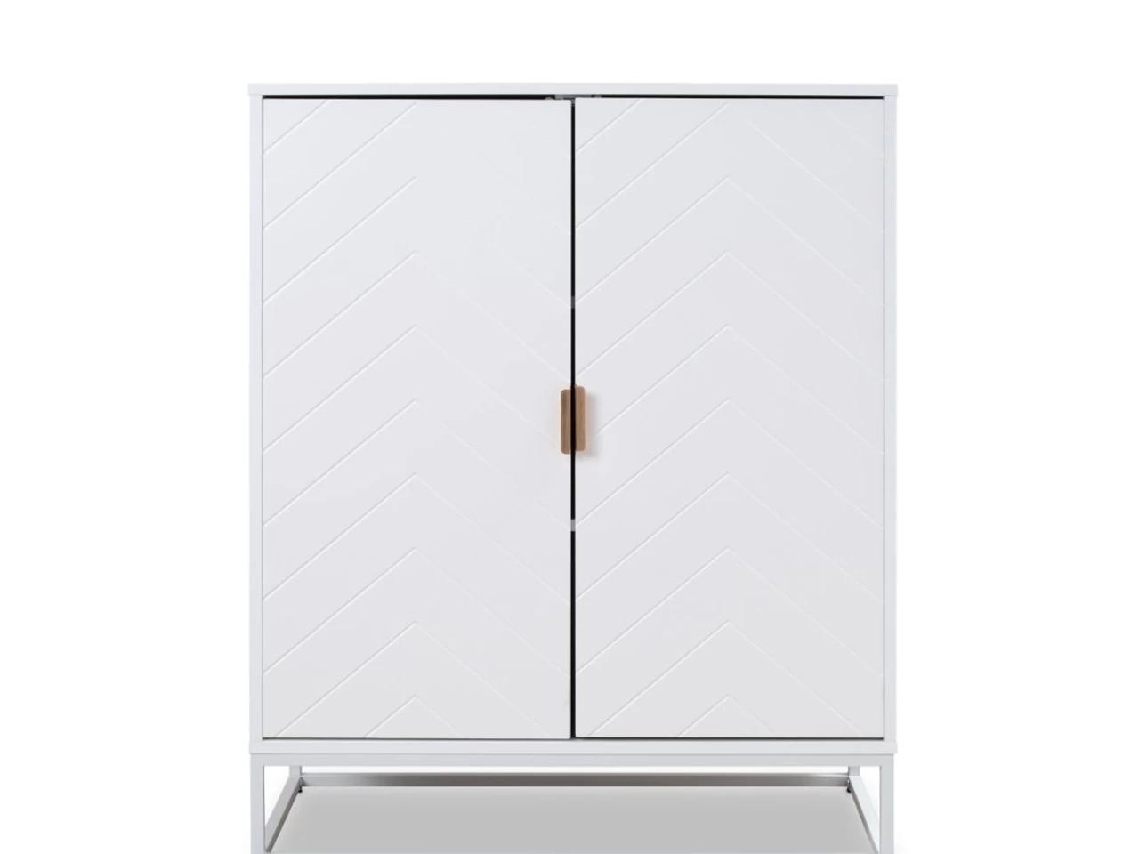 The Inca Two Door Cabinet is a luxe storage cabinet to keep your home clutter free. Offering two spacious cupboards, complete with adjustable internal shelving and swing doors, this cabinet is super versatile and gives you customisable storage to suit your needs. Whether storing dog leads, shoes and hats at your entryway, paperwork and stationery in a home office or a stylish unit to use as a drink’s cabinet, this two-door storage cupboard is a perfect choice. A stylish addition to your home, use the surface to style with décor, plants, sculptures and more. We love the subtle, engraved pattern on the cupboard doors which adds stunning texture and interest to a space. The neutral bright, white finish, accented with rose gold handle details, gives this two-door cabinet a luxe yet timeless style.