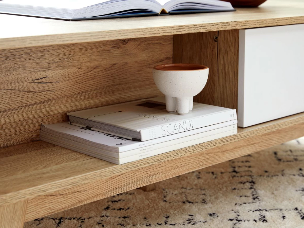 The Jesse Coffee Table enables you to keep the items you want close by, while tucking away magazines, coasters and remotes. The wide, rectangular surface is the perfect space to put your coffee down, so you can put your feet up!