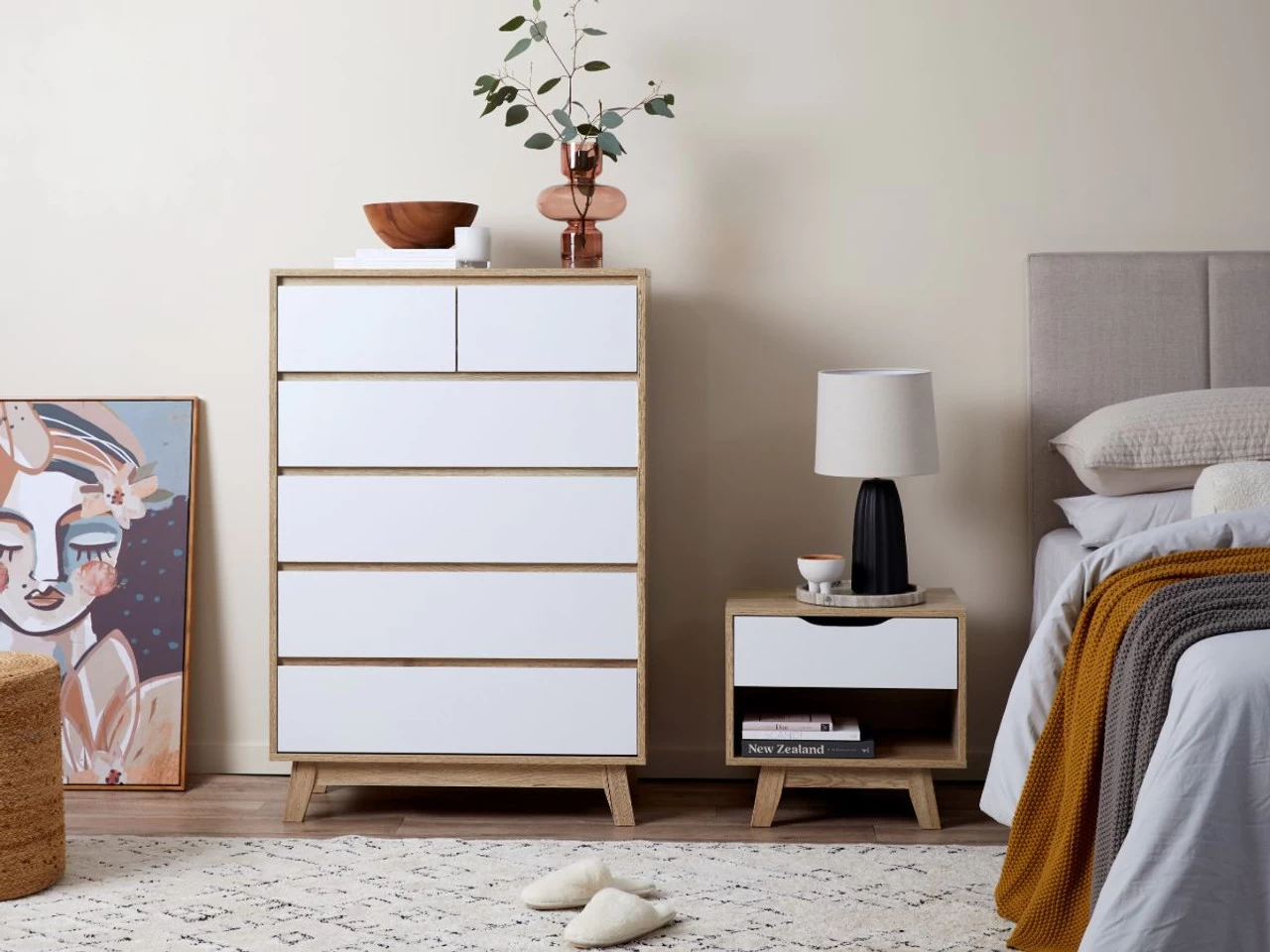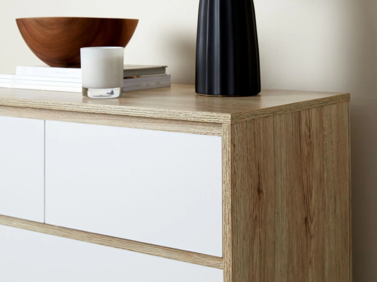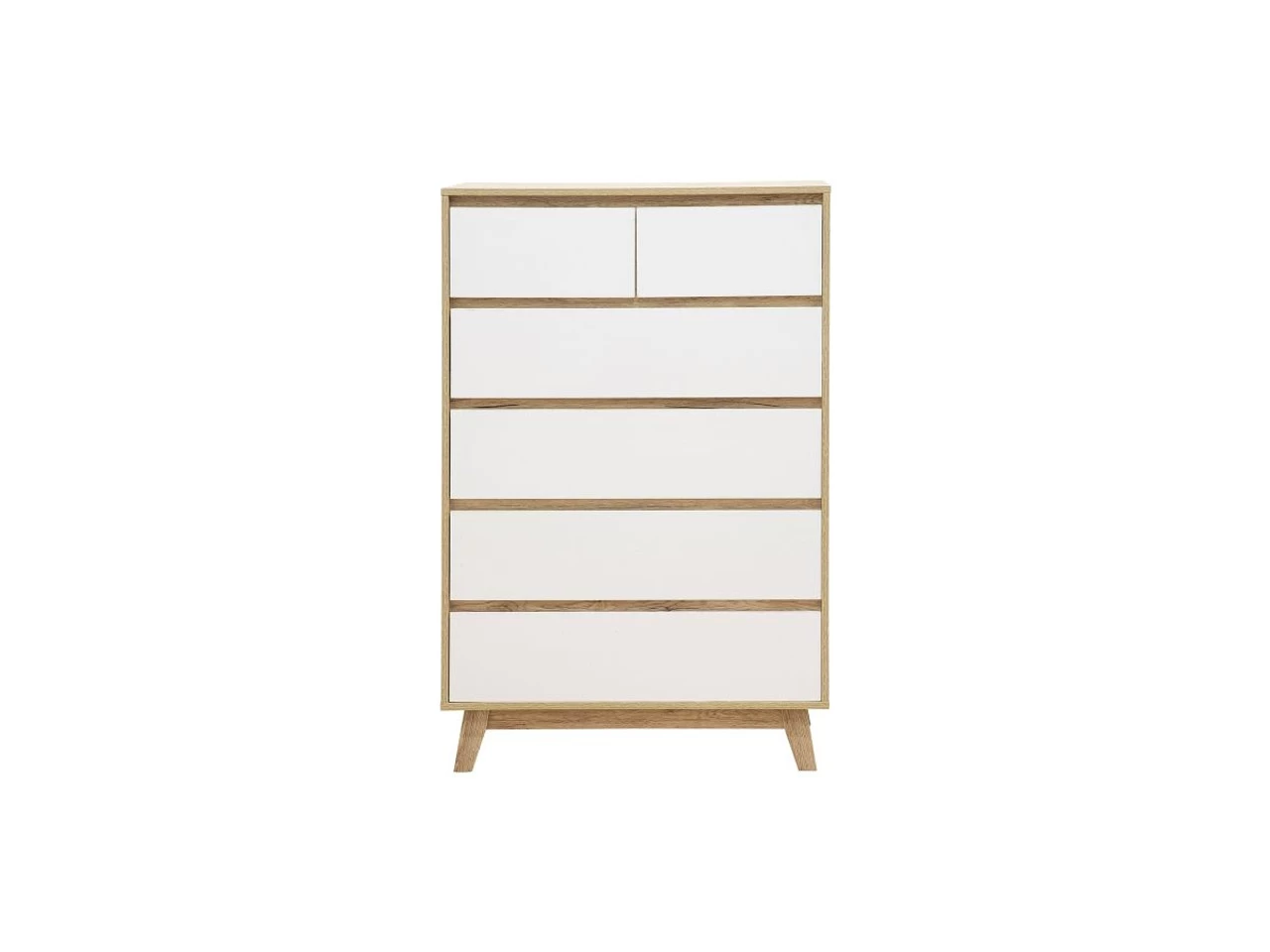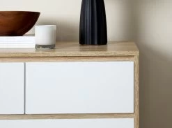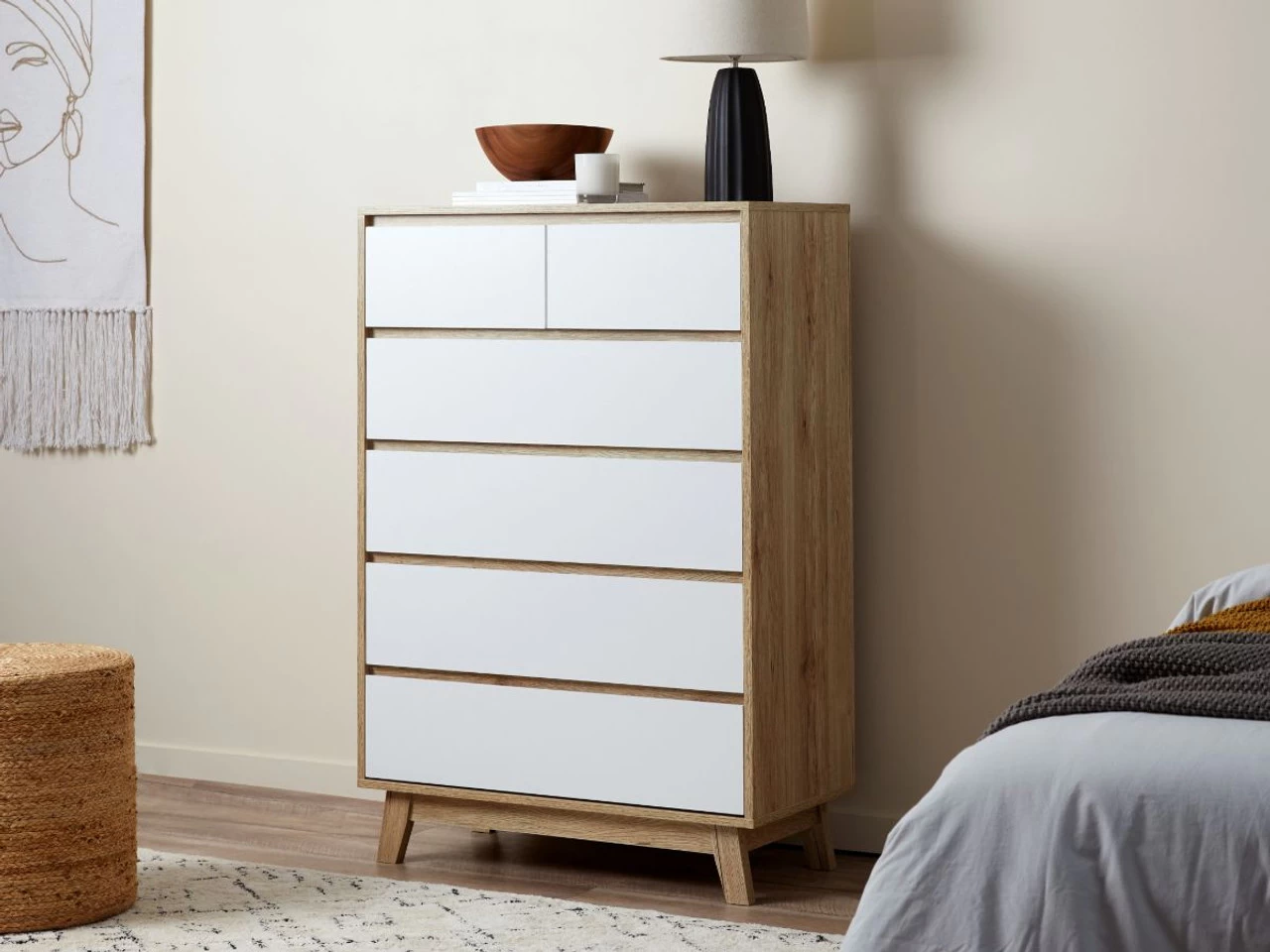 Practical and stylish, the Jesse Tallboy has been made with modern homes in mind. Featuring a warm wood veneer finish that embraces varying tones and wood-grain patterns (and perfectly paired with crisp white drawer fronts), this storage unit brightens a space and gives your home a decidedly beachy vibe. The six drawers are perfect for everything from clothes in the bedroom to freshly laundered linen in a home low on cupboard space. Wonderfully versatile, you can add essential all-purpose storage into your home and a fresh new look all with this singular modern cabinet.