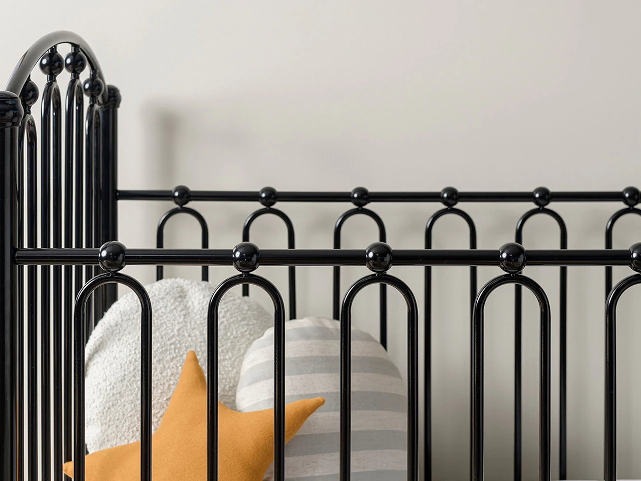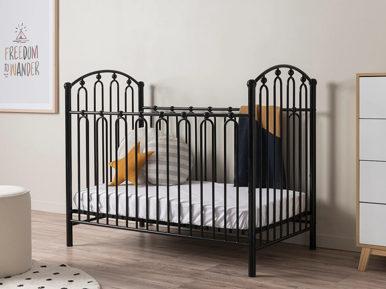 The Josephine Cot – Black is a vintage metal cot with modern safety. Featuring tall, arched side panels, decoratively looped rails and metal beading, this metal cot creates a stunning contrast in a modern space and a traditional look and feel to a heritage home. Made from powder coated iron, this traditional, black cot is strong and durable, and has fixed sides. Featuring an adjustable base, the base features two height options including a higher setting for newborns and a lower height setting for older babes. This means you can easily adjust to suit your baby’s age and development. We love the deep, black colourway which adds cool, monochrome styling to a nursery and creates the perfect backdrop to style colourful bedding, toys and more.