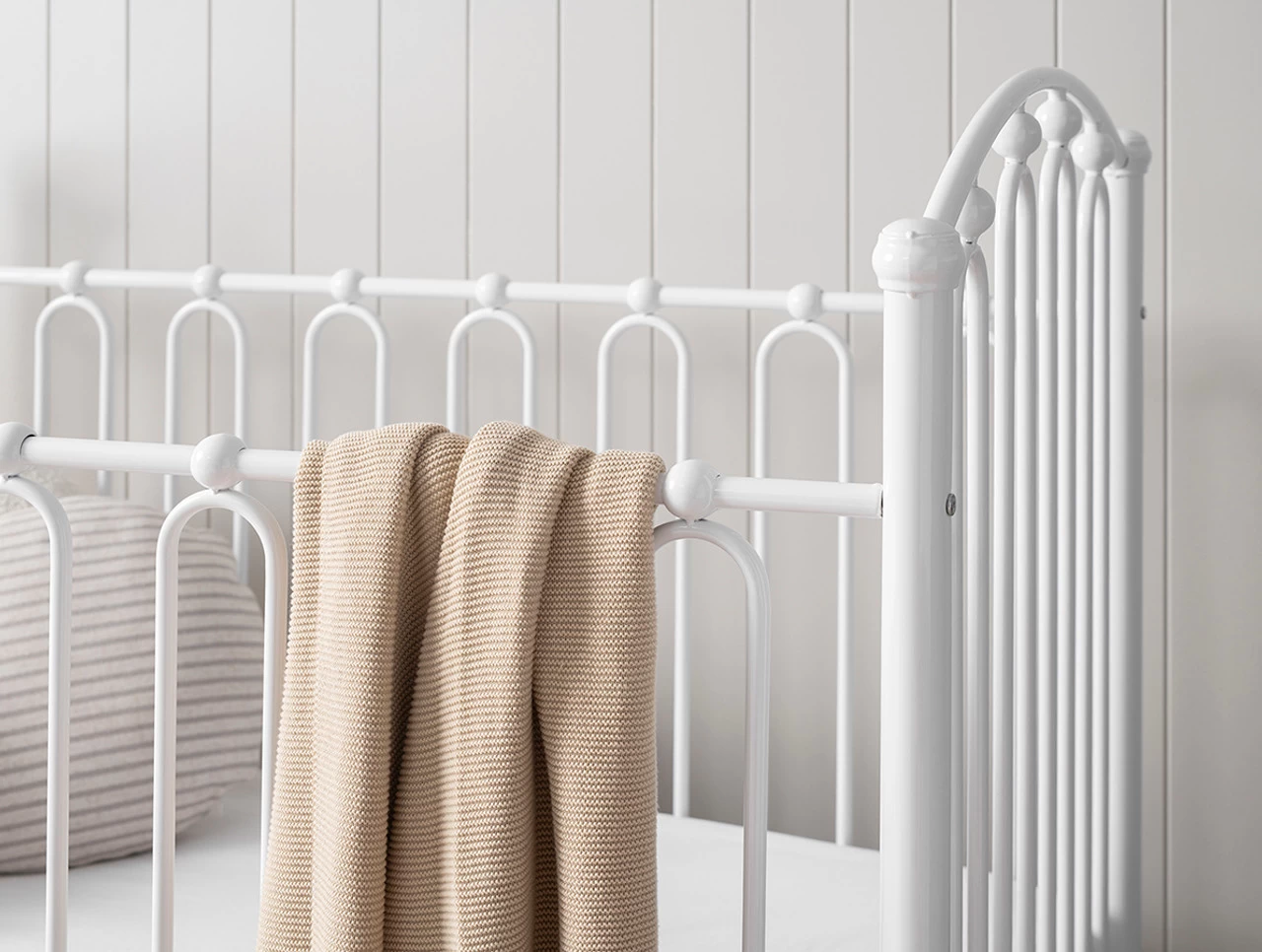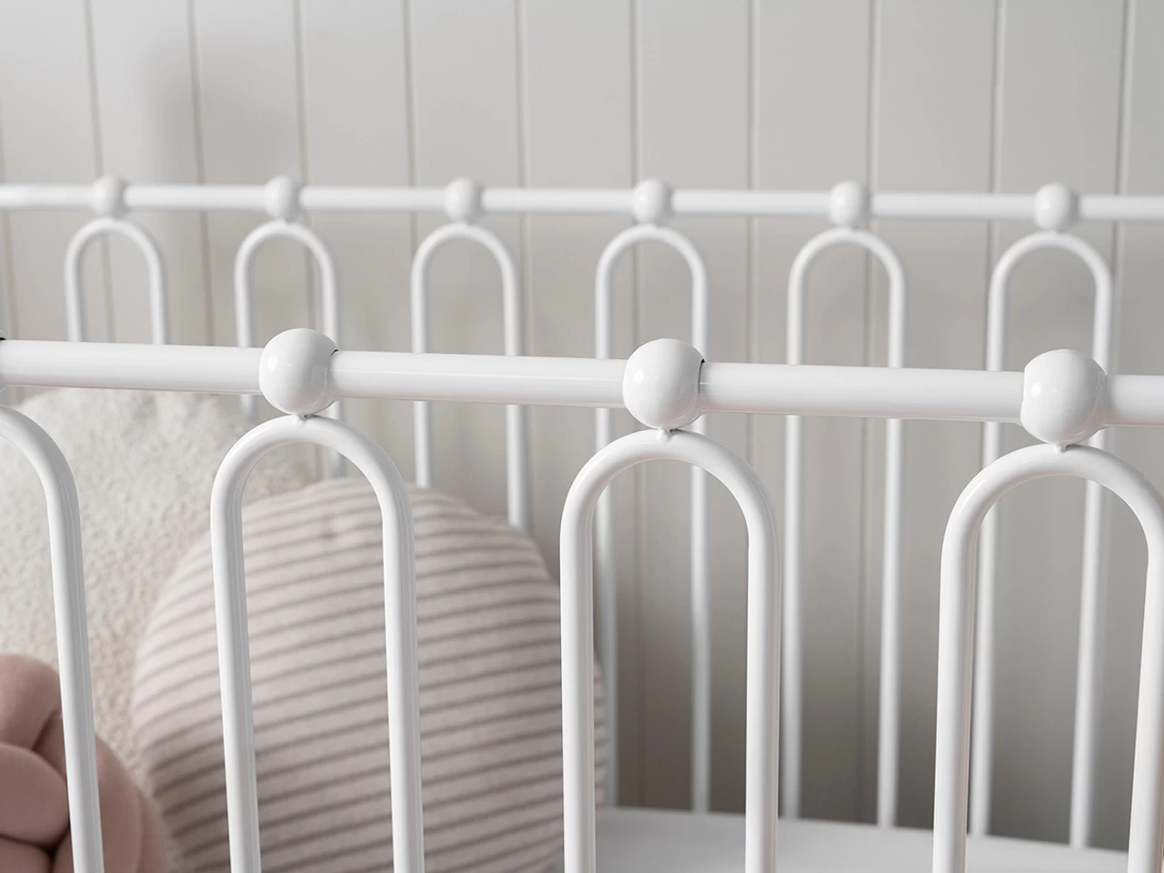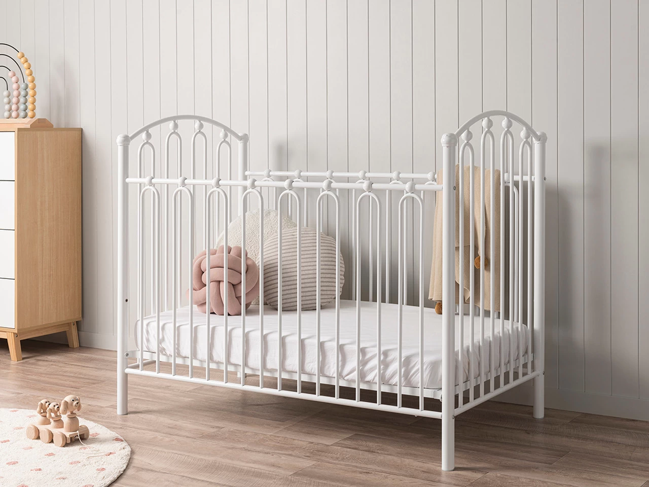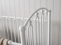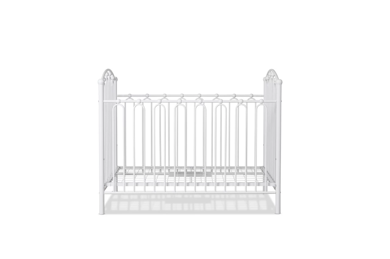 The Josephine Cot – White is a vintage metal cot with modern safety. Featuring tall, arched side panels, decoratively looped rails and metal beading, this metal cot creates a unique style in a modern space and a traditional look and feel to a heritage home. Strong and durable, this white cot is constructed from powder coated steel and has fixed sides.