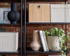 Add natural style to your shelves with the Kata Cube. This cube storage box has a gorgeous bamboo finish and a fabric lining, making it an elegant option over traditional cube storage. Stack it on a shelf or in a cupboard – either way you can easily organise your linen cupboard, bedroom wardrobe, laundry, or the kid’s bedroom/play area. The classic cube shape means it fits perfectly in a cube storage unit for a tidy and stylish home. It has a metal hole handle which makes it super easy to access whatever you store inside. Be sure to browse the rest of the Kata range for even more stylish storage boxes.