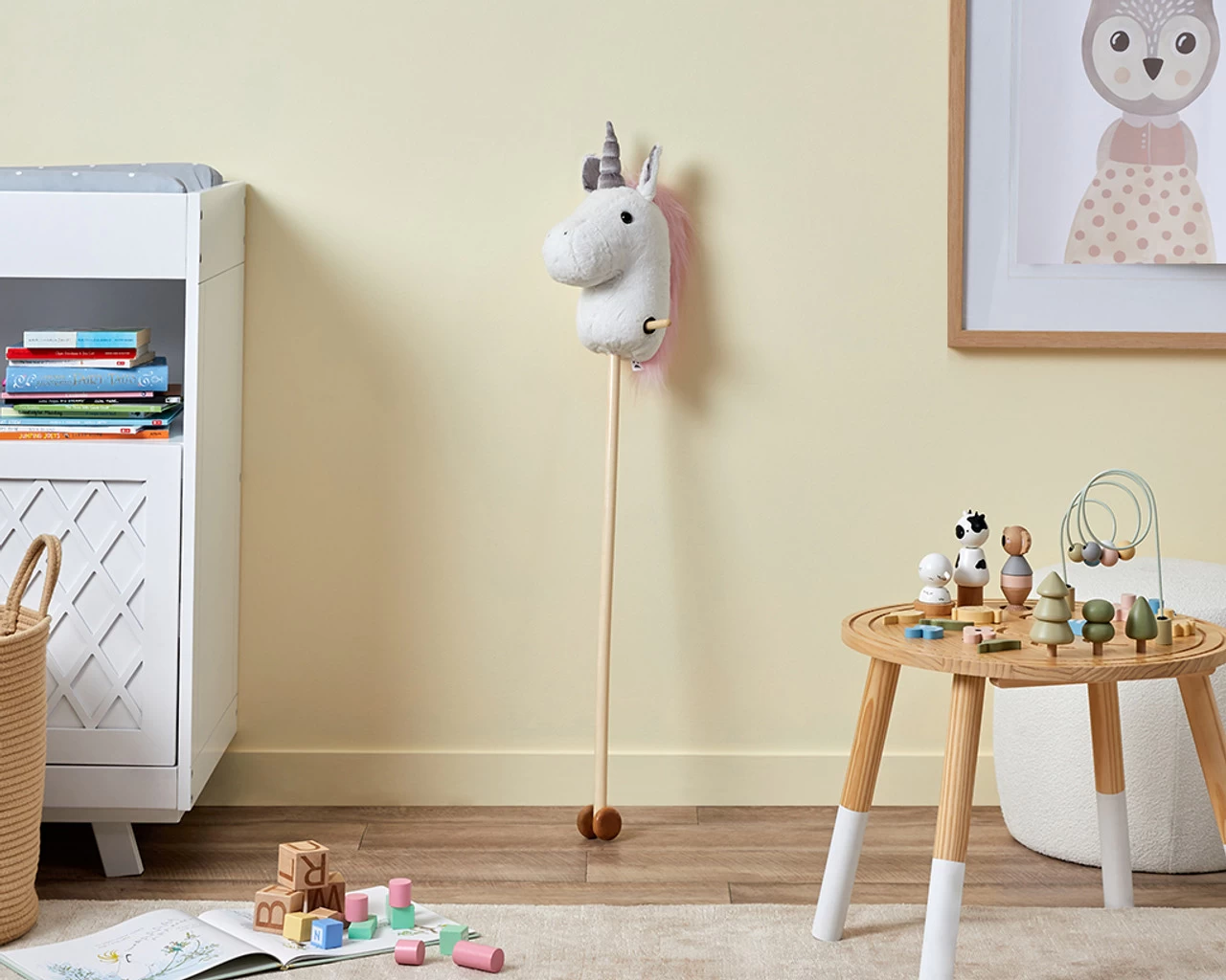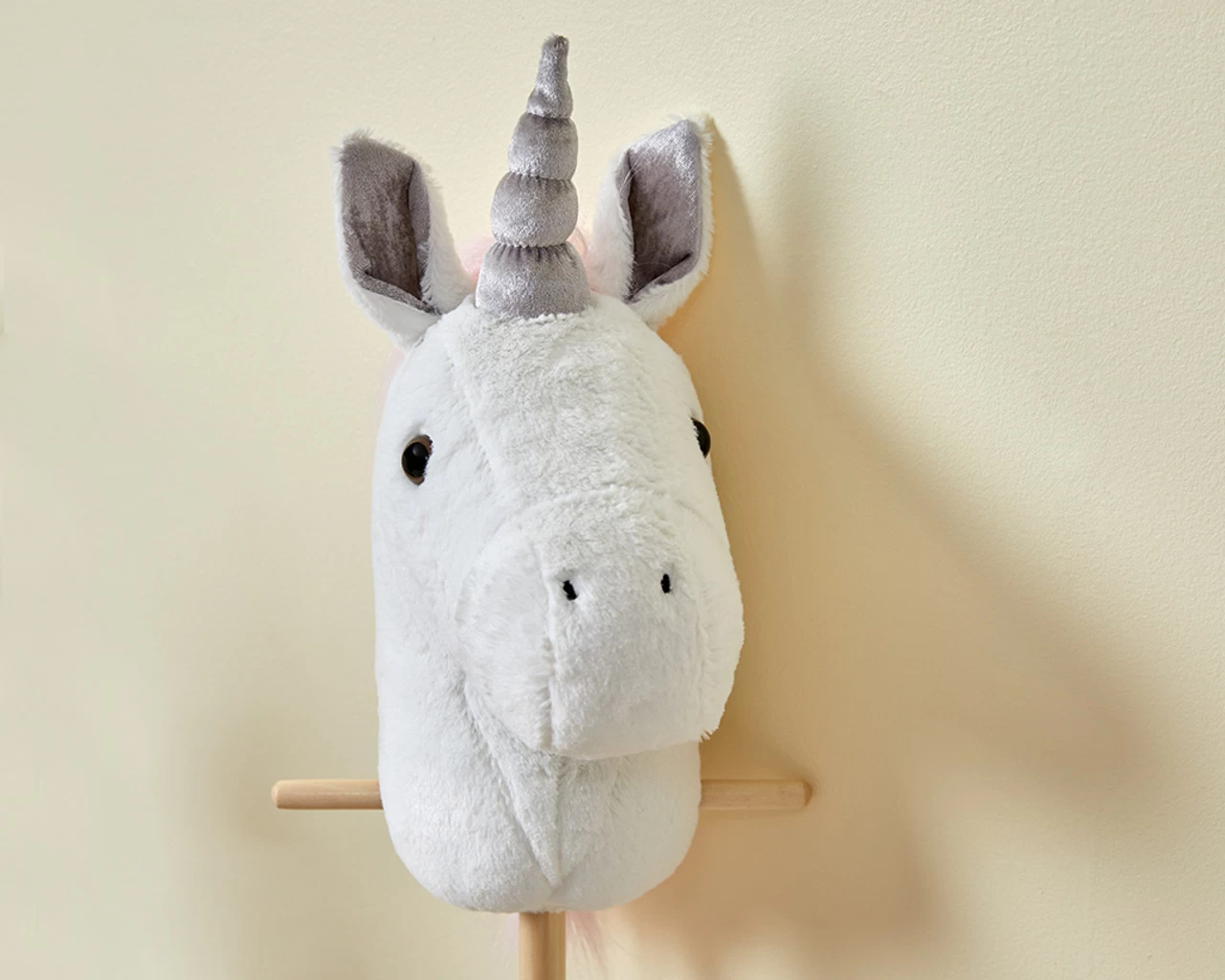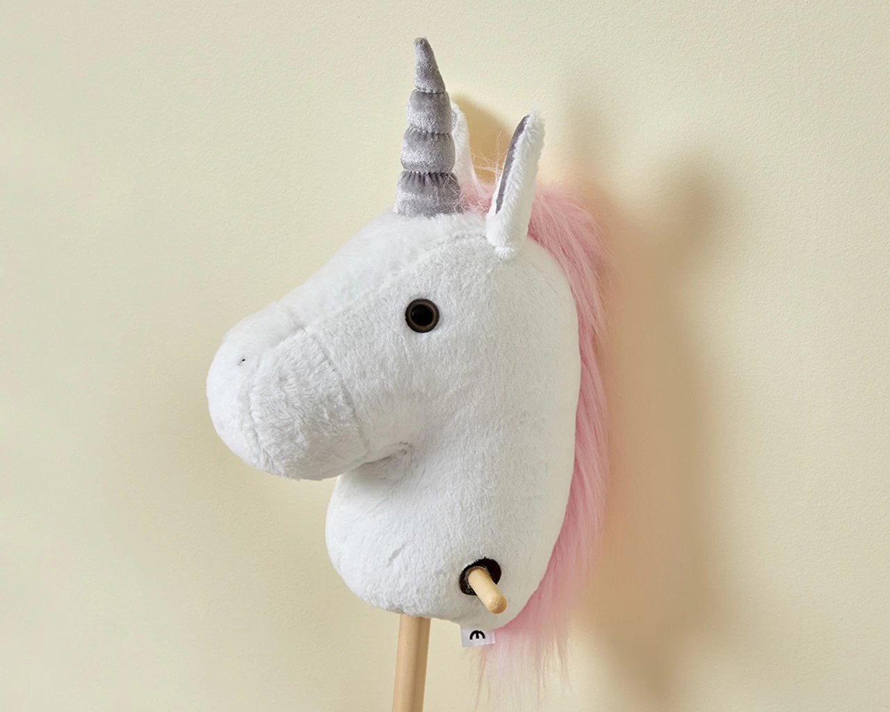 Gallop and prance in play with the Kids Hobby Unicorn – White. This hobby toy features a long stick with handles and wheels for comfortable and easy use. As if straight out of a fairy tale, the plush head has a flowing pink mane and bronze horn that will enchant any child, making this the perfect spirited steed for imaginative adventures. A great way for friends and siblings to play together, this hobby unicorn encourages children to get active and use their imaginations in creative play.